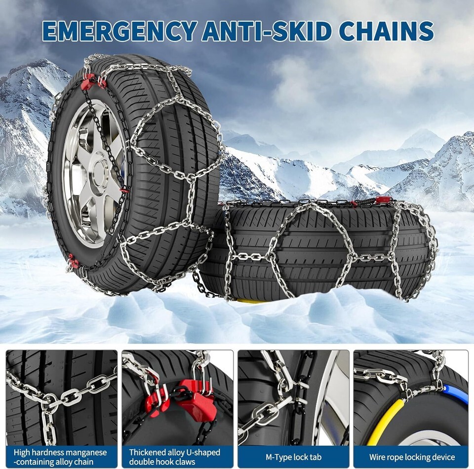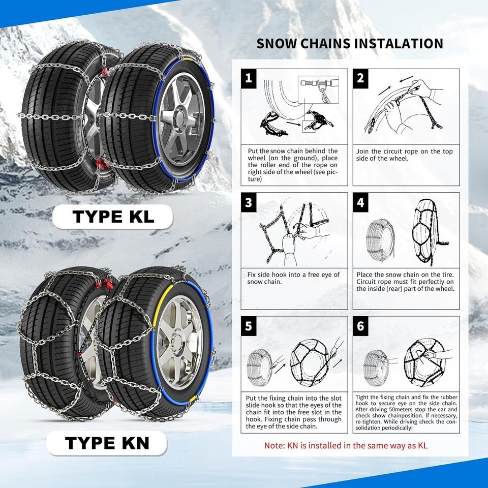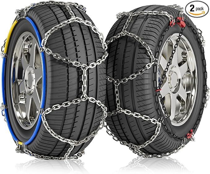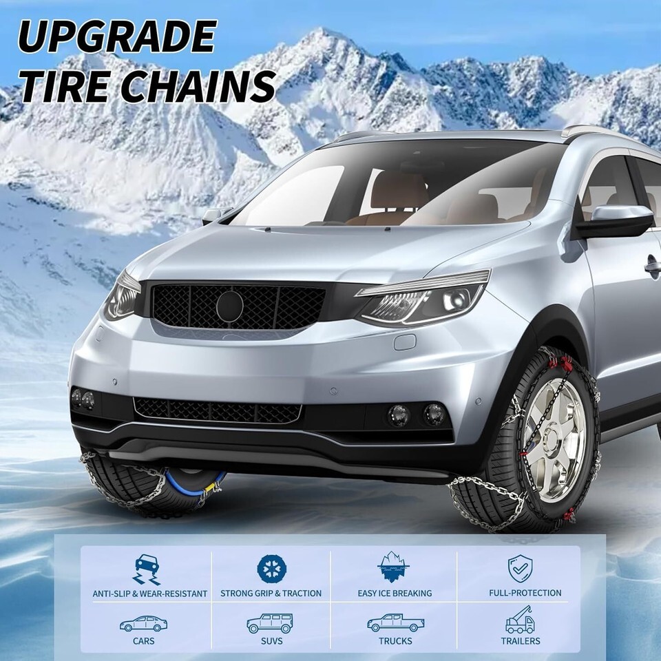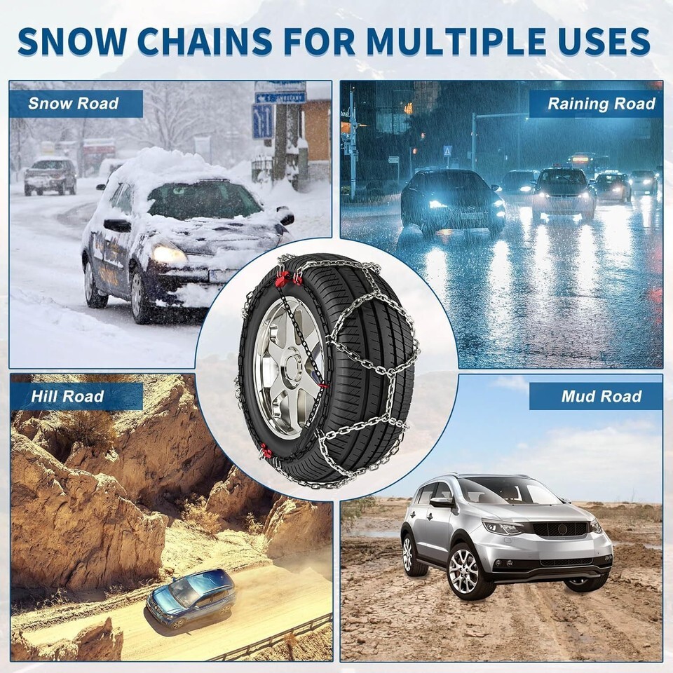 ?Quality Tire Chains?: Made of high-quality materials, it can withstand heavier loads, each car snow chain is composed of thick chains, strong grip and wear-resistant, strong anti-skid ability. The snow chain can provide smoother and safe driving. ?All-Around Traction?: Greater durability and better all-around traction performance than conventional tire chains or cables. ?Diamond Pattern Cross Chain?: Diamond tire chains pattern insures a comfortable drive with less vibration and noise. Net type design, gaining excellent traction. D-profile crosspieces for special good grip on ice, snow and soft hail. ?Easy Installation?: The anti slip snow chains is easy to install and safe to use. You can complete the installation in a few minutes without moving the car. ?Notice?: The cable tire chain is designed to meet the everyday traction product needs of the average consumer, it is available to fit most passenger car tire sizes. Please confirm the snow chain match for the tire size before using.