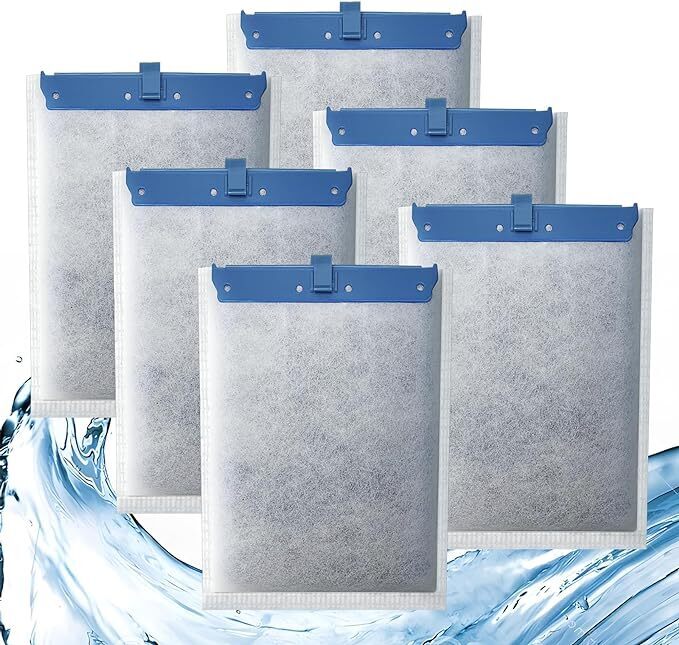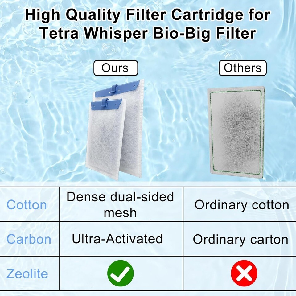 -?Filter Cartridge for Tetra Whisper?6pcs Large Remplacement Filter Cartridges, Unit Size: 5.1 * 6.7 inches. This aquarium filter cartridge is compatible with Whisper Bio-Bag External Filter PF20, 30, 40, 60/ Whisper External IQ20, 30, 45, 60/Whisper 20i 40i Internal Filter and TetraFauna ReptoFilter 50 gallons (125 GPH). -?Four-Stage Filtration?The filter is made of dense dual-sided mesh, Better thickness provides better filtration, Ultra-Activated carbon instead of ordinary carbon and also add processed zeolite, which can effectively filter and absorb impurities in the water to keep the clean water source and provide the healthy growth environment for fish. -?Efficacy of Zeolite?It can adsorb ammonia, heavy metals and other harmful components in the water. Effectively balance the PH value of the water body to achieve a stable water state. Zeolite can improve the fertilization efficiency of aquatic plants, make your aquatic plants, nitrifying bacteria grow faster, live more comfortable and more health. -?Quick Installation?Turn off and remove the used cartridge and flush the new cartridge under cool clean water or water of aquarium to remove dust. After rinsing, insert the cartridge into the flushing chamber and make sure the filter cartridge fits completely into the chamber. -?Professional After-sales service?TIPS: We recommend that you replace the filters every 2-4 weeks to maintain water quality.(It depends on the number of fish in fish tank). We are professional in the field of Aquarium Filter Cartridges, if you have any problem, please feel free to contact us.