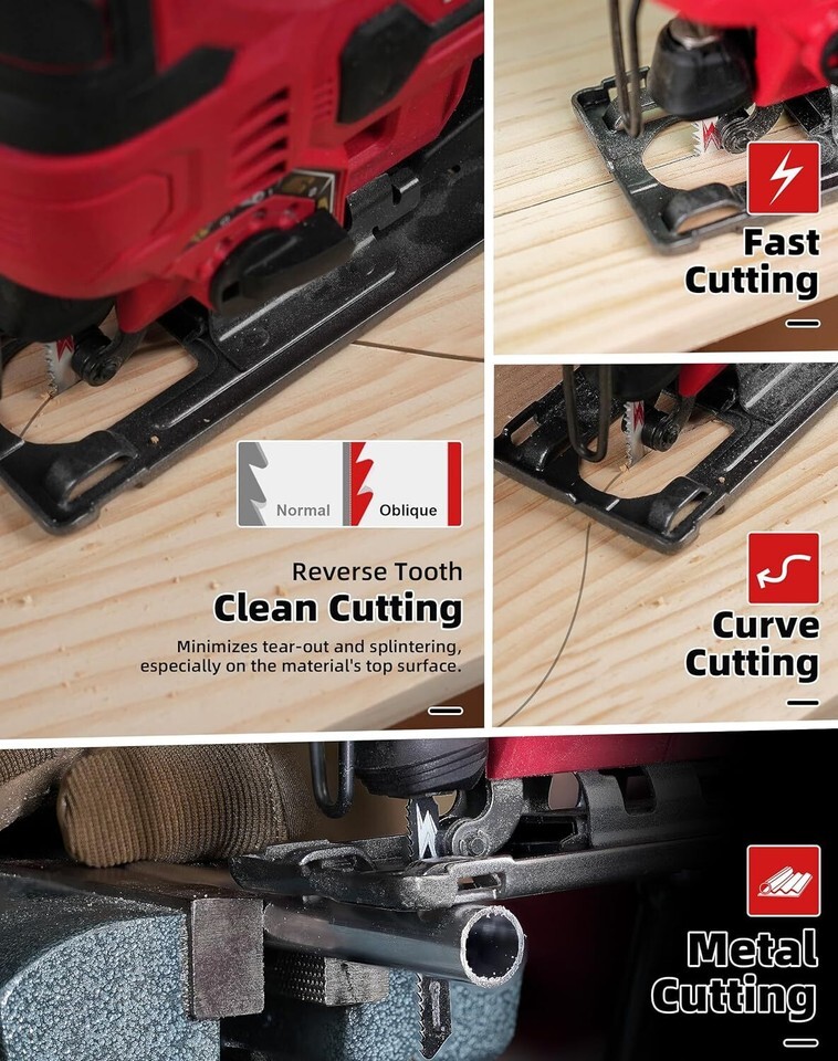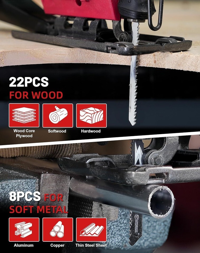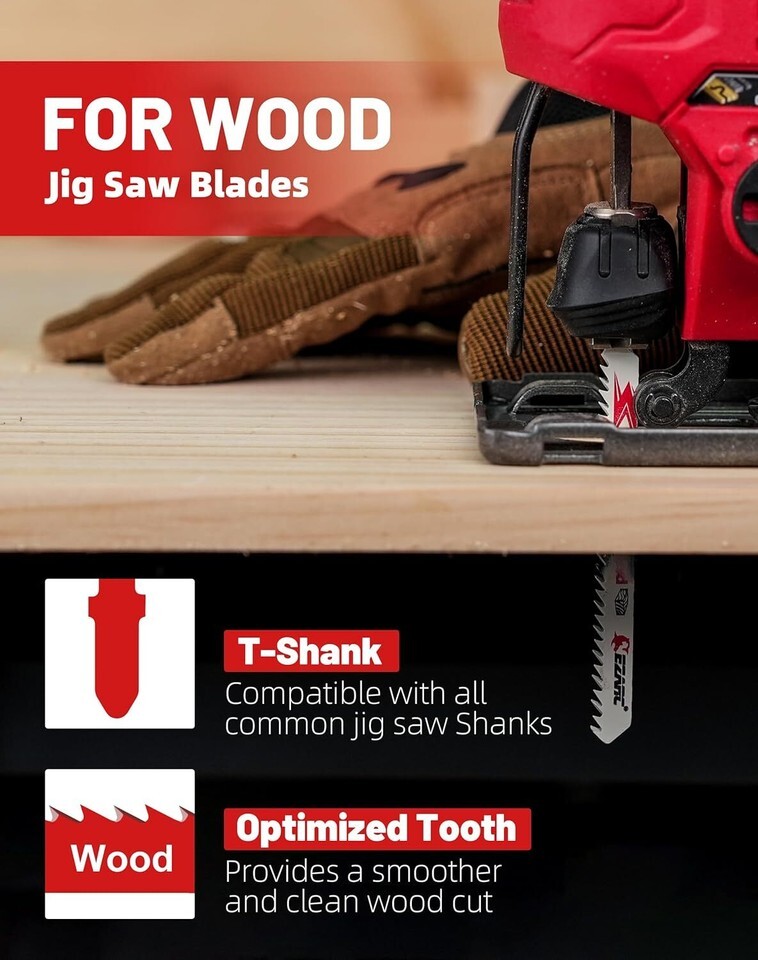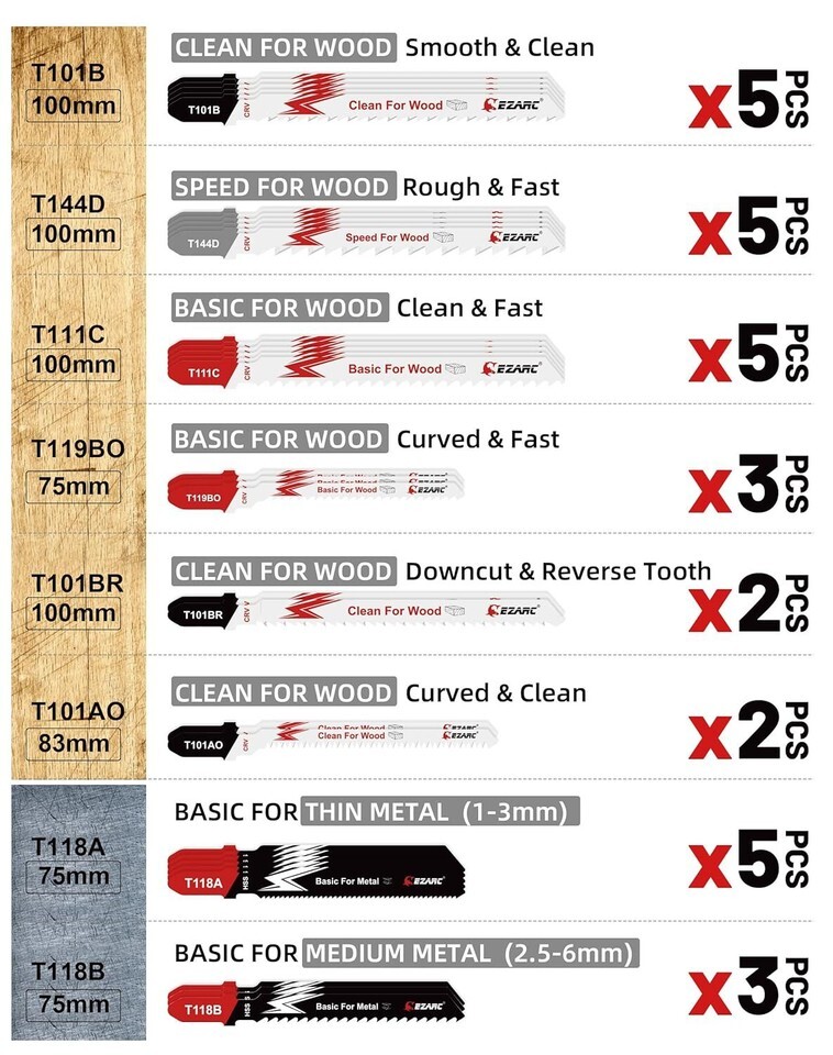 ?General Purpose Blades?EZARC introduces the All Purpose Jig Saw Blade Set (30-Piece). This jig saw blade kit contains a variety of fast, smooth, fine, reverse and scroll blades comprising a handy set for tackling common wood projects, plastic and thin-metal cutting. ?Effortless Cutting?This Jigsaw blade set features a range of blades, including chrome vanadium steel for soft woods, and high speed steel for metal. Optimized reversed tooth design for clean bottom finishes. ?What You Get?The jigsaw blade set includes 8 different types, covering all usage scenarios. T101B clean for wood (4'', 10TPI), T101BR reverse cuts in soft wood (4'', 10TPI), T144D speed for wood (4'', 6TPI), T111C basic for wood (4'', 8TPI), T101AO curve cuts in soft wood (3-5/8'', 18TPI), T119BO basic for wood curves (2-15/16'', 13TPI), T118A basic for metal (2-15/16'', 20TPI) and T118B speed cutting for metal (2-15/16'', 13TPI). ?Storage Case?The provided storage case, compact and robust, serves to safeguard and neatly arrange the blades. Designed for easy transport, it simplifies the task of selecting the appropriate blade for each job. ?Compatible?T-shank design fits all combo and most U-shank cordless and corded jig saws. Includes as Bosch, DeWalt, Metabo, Craftsman, PORTER-CABLE, Makita, Ryobi, Milwaukee, Skil, AEG, Black Decker, Hitachi etc.