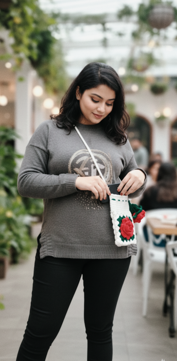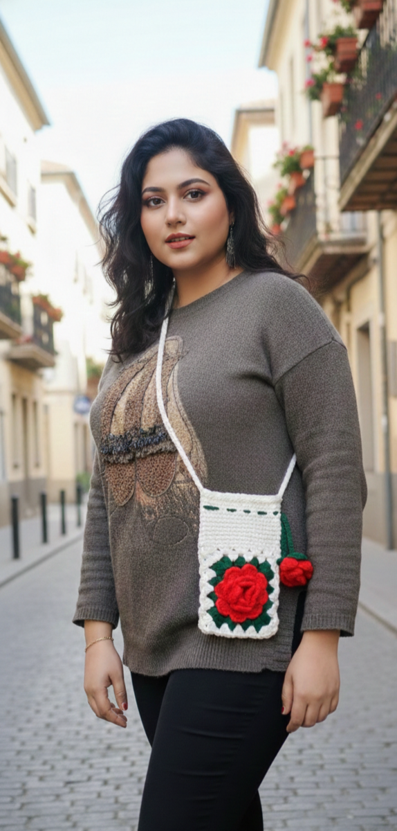 Add a touch of elegance to your everyday style with this lovingly handcrafted crochet phone pouch. Designed with a stunning red rose floral pattern and soft premium yarn, this mini sling bag is perfect for carrying your mobile, small essentials, or gifting to someone special.