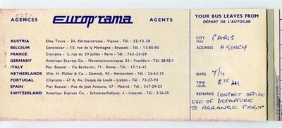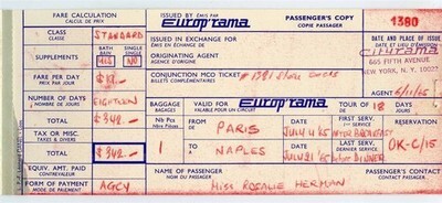 A 4 page passengers copy. Europ'rama Passenger Ticket for use from Paris to Naples in 1965. Issued by Cityrama