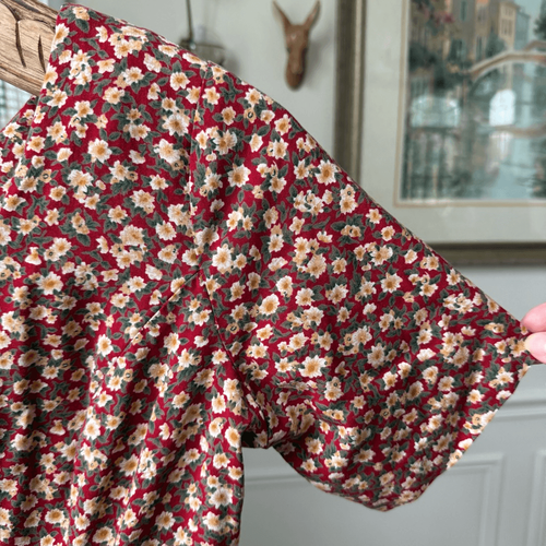 Vintage 90s Express Compagnie Internationale romper made of 100% rayon in a rusty red color with beige tan and green small floral print. Buttons down the front with a back tie for a little waist definition and a 6 inch inseam. No noted flaws. 18 inches armpit to armpit 15 inches straight across the waist untied and 21.5 inches across the hip