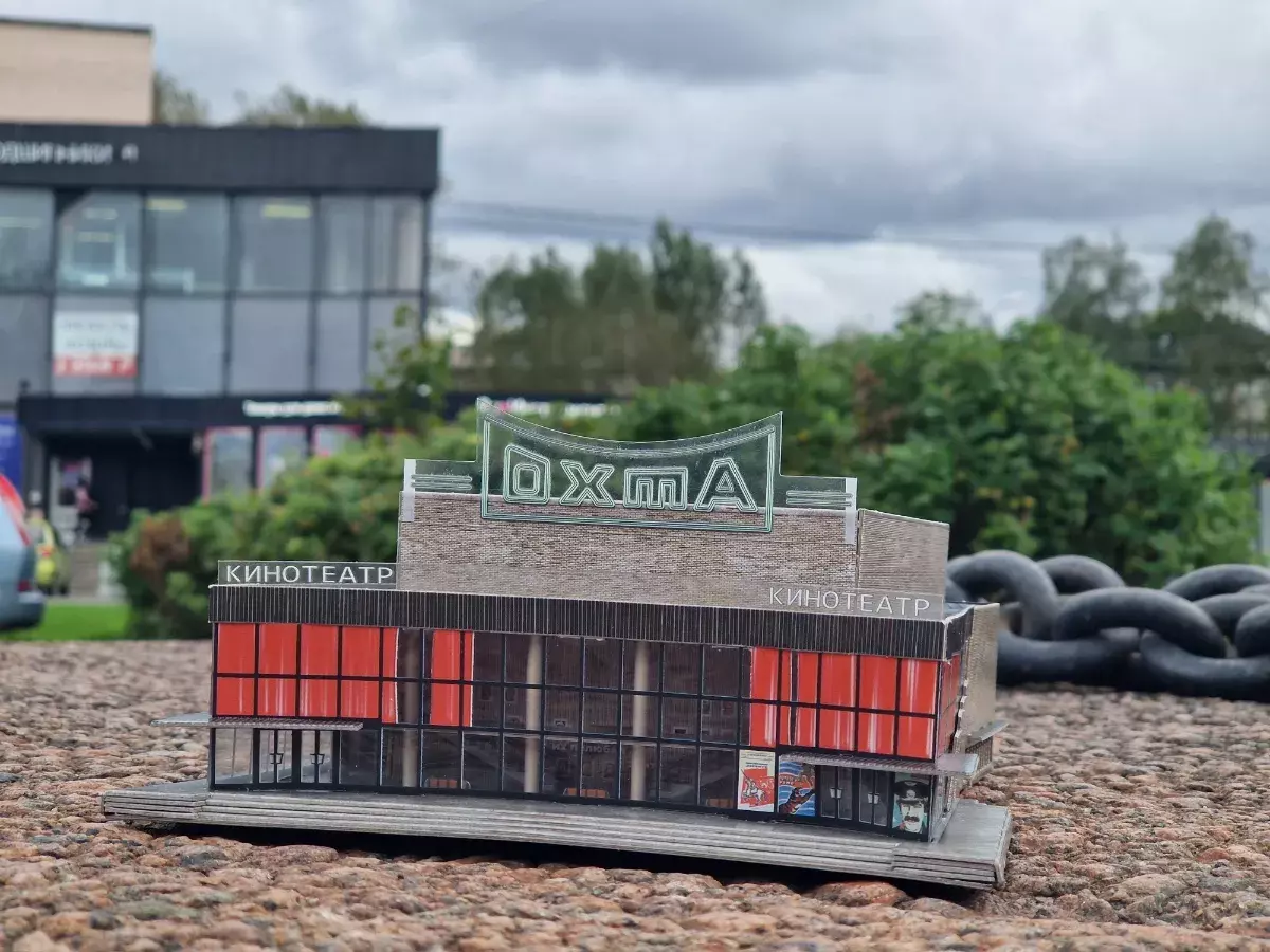 A detailed cardboard model of a typical Soviet-era movie theater building.