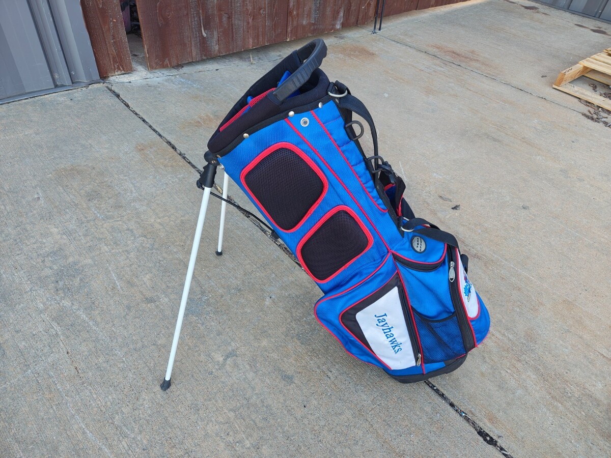 You are bidding on a kansas golf bag. The bag shows quite a bit of wear all pockets and zippers in working order. The raincover is included with the bag.
