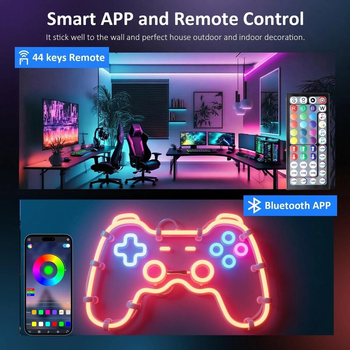 ?Dual Control Mode?44-key infrared remote control and Lotus Lamp APP dual control mode. According to your own needs, you can set the color, brightness and timed on/off of the light strip more conveniently. Both the elderly and children can handle it easily