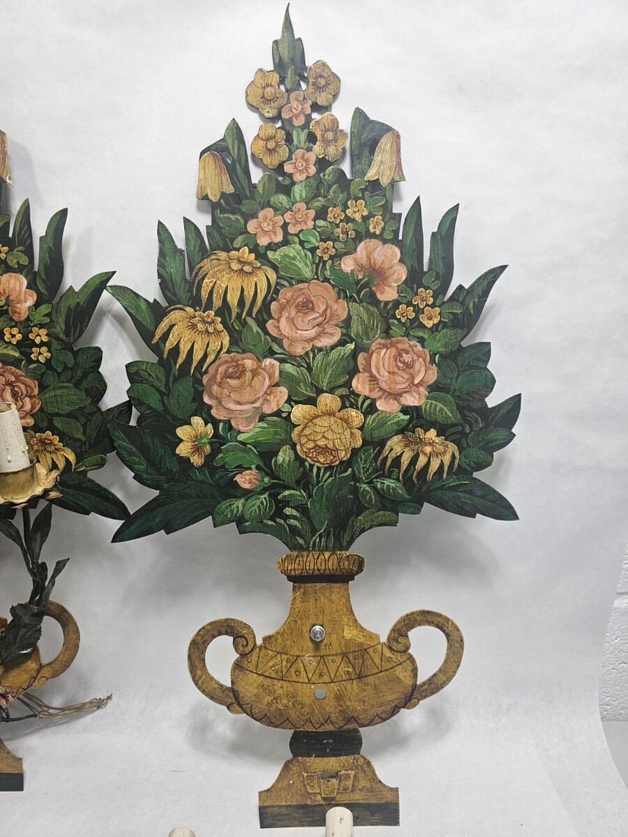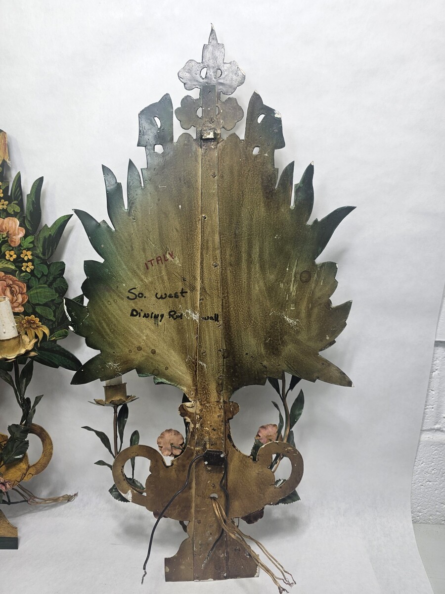 Vintage Pair Italian Tole 3 Candle Electric Wall Sconces Hollywood Mid Century