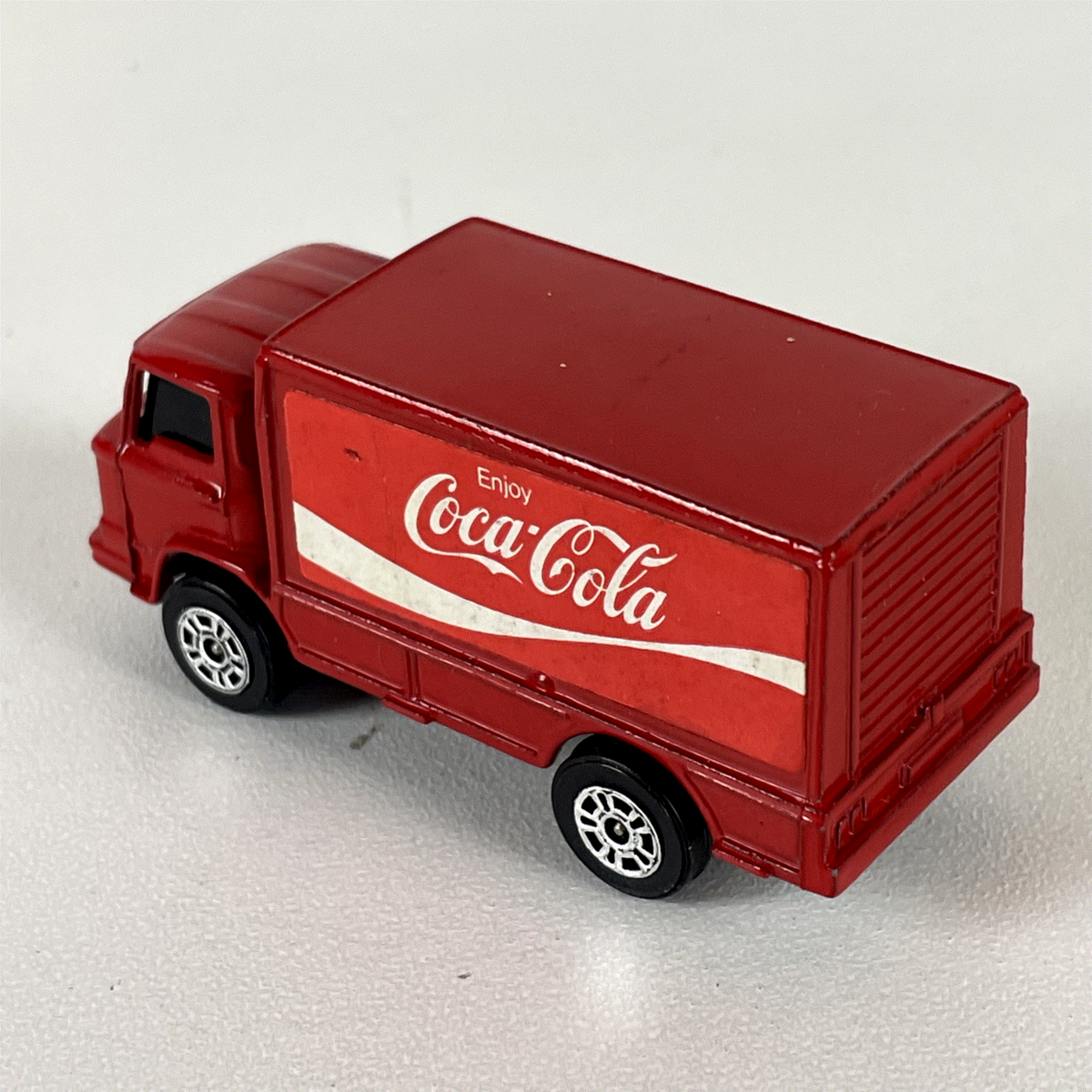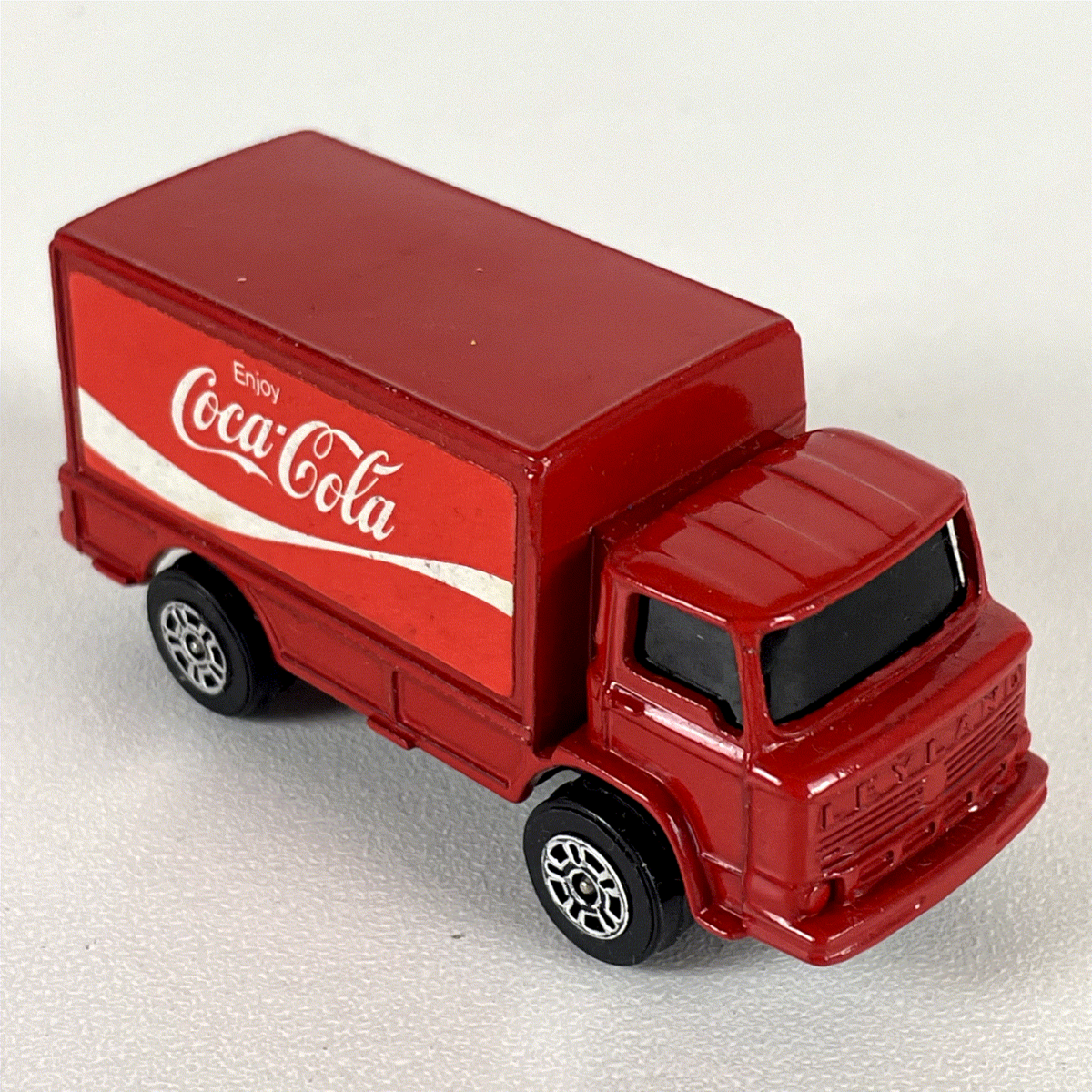 Discover this authentic vintage Corgi Juniors Leyland Terrier diecast truck, a charming collectible featuring iconic Coca-Cola branding. This meticulously crafted miniature showcases a vibrant red finish, complemented by the classic "Enjoy Coca-Cola" logo in white and red on its box sides. The Leyland Terrier model is clearly visible on the front grille, adding to its accurate representation.