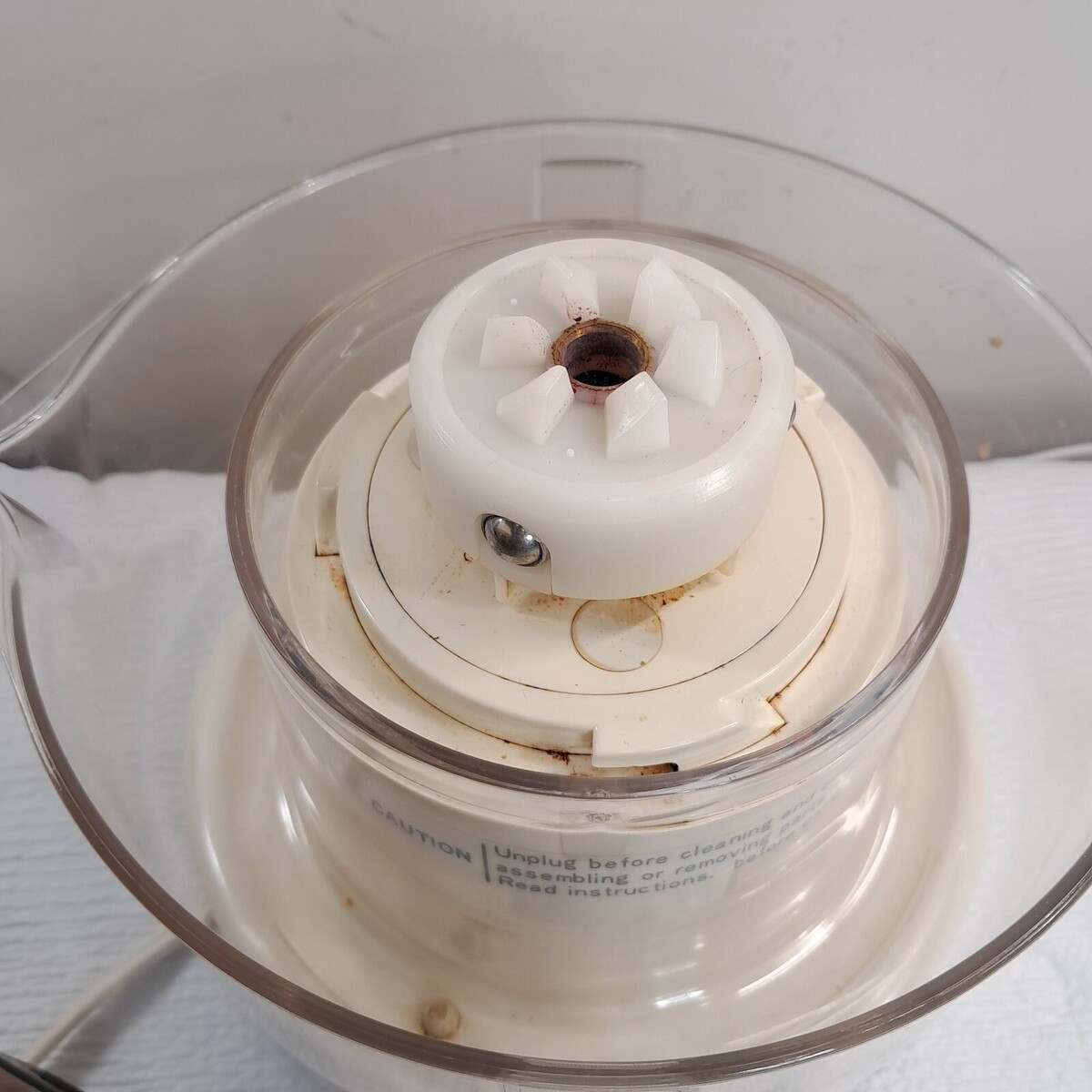 Works. Wear/marks/scuffs/scratches/ as shown. I think it may be missing the center piece to push the fruit down, but it does work fine if you use something else.
