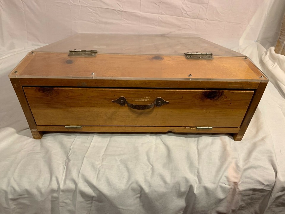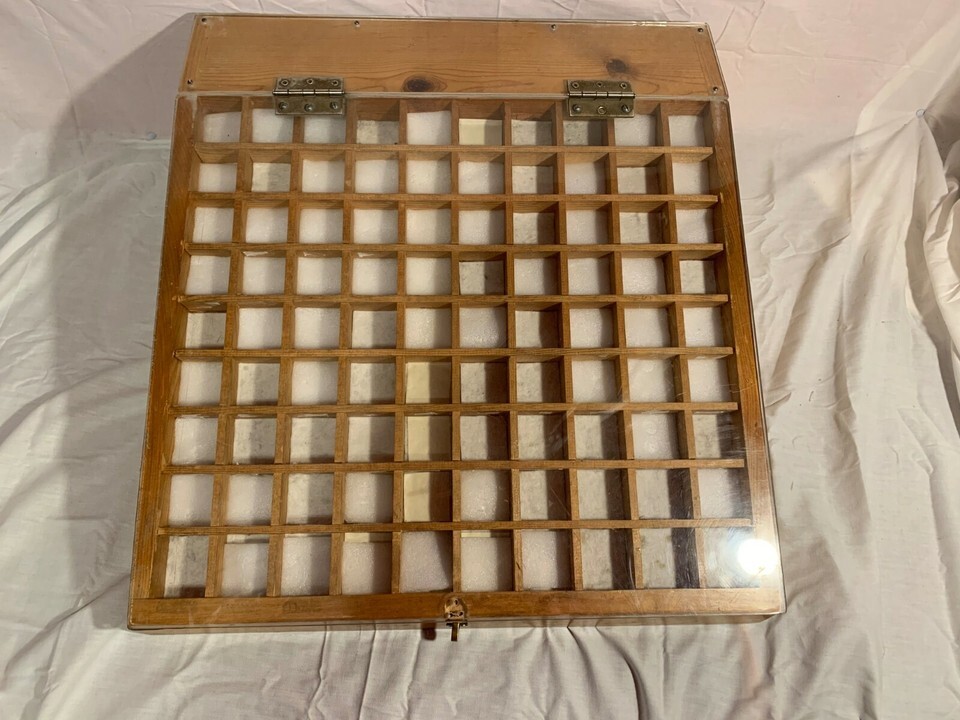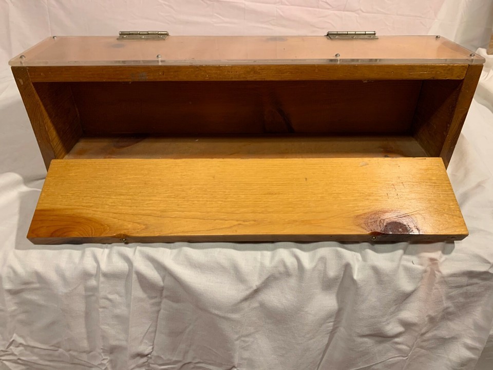 SOLID WOODEN SECTIONED ORGANIZED LOCKING PLEXIGLAS PULL DOWN DOOR DISPLAY CASE