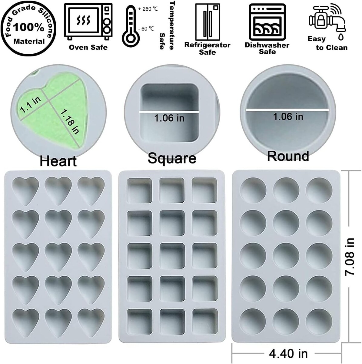 Heart shape cavities: Approximately 1.1 x 0.7 inches; Round and Square shape cavities: Approximately 1.06 x 0.7 inches.