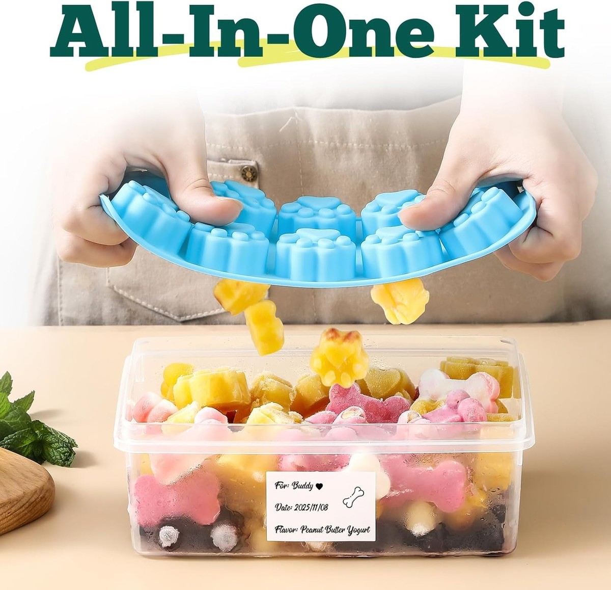 Complete Dog Treat Mold Set: 4 Non-Stick Silicone Paws & Bones + Storage Bin