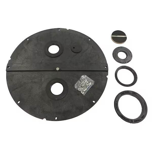 Includes 1- 4 in. molded basin inlet hub, 1- 3 in. molded cover slip flange, 2- 2 in. molded cover slip flanges, 1- 1-1/2 in. molded cover slip flange, 1- pump cord grommet, 8- stainless steel washers and bolts and 1- roll of cover sealing tape