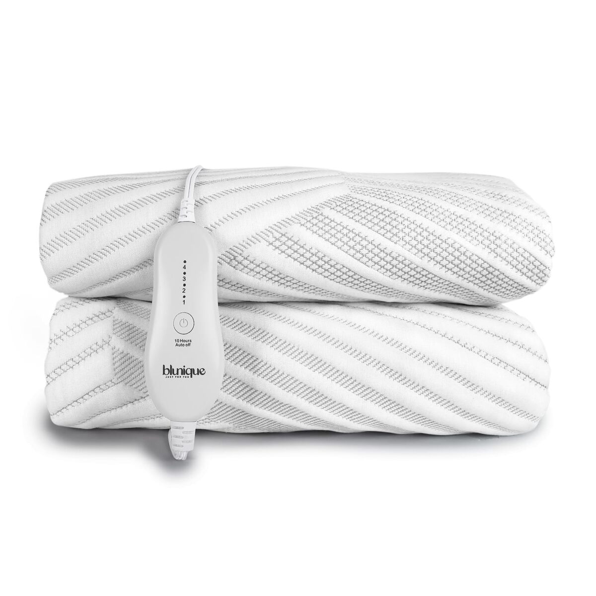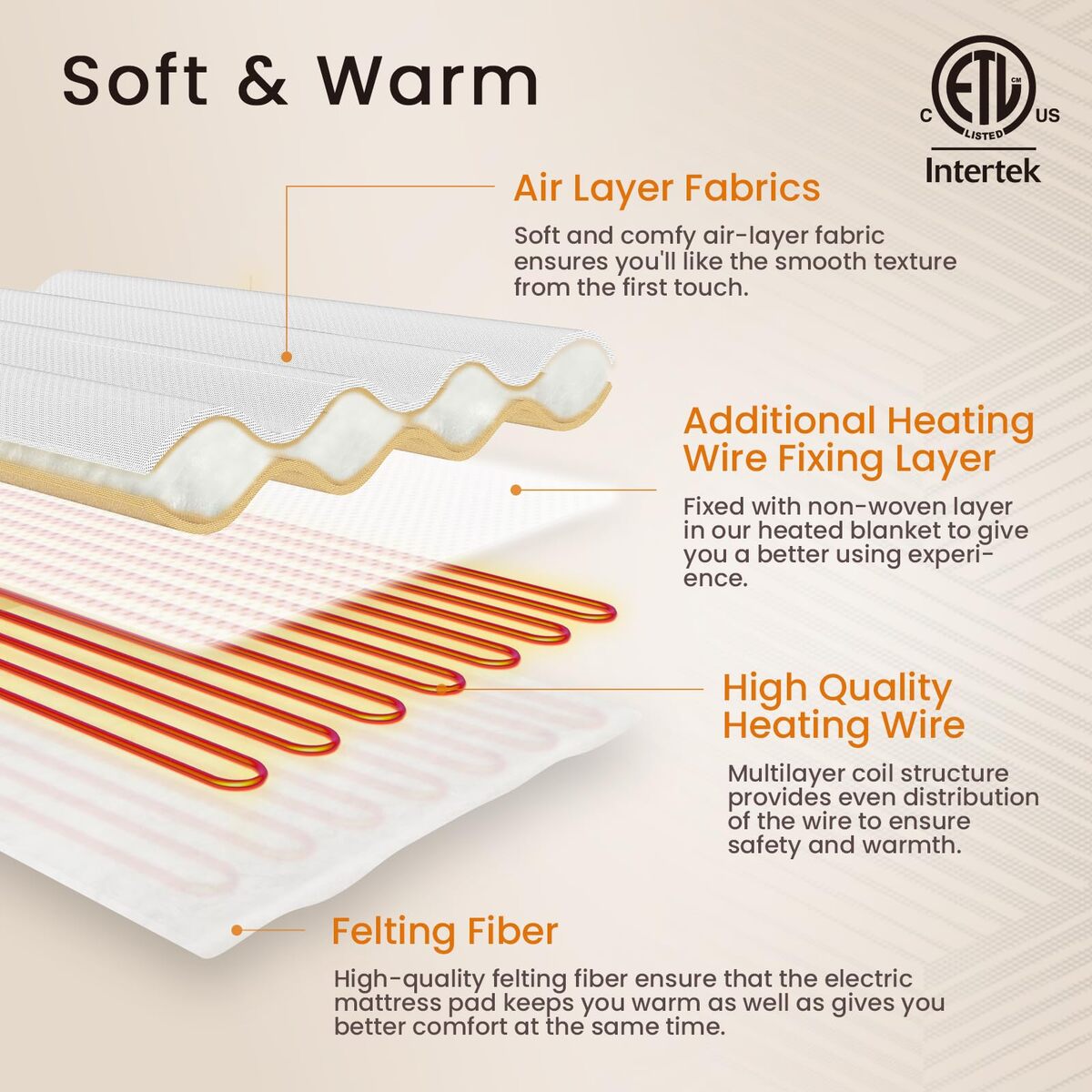 Comfortable and Cozy - blunique heated mattress pad features soft air layer fabric. The 3D structure of the fabric creates an an insulating layer, keeps warmth by trapping air and provides cushioning and padding properties, which garantee you an ultra-soft feel and a warm sleeping experience.,Thoughtful Cord Organizer - blunique has designed a practical way to keep the cords well organized to avoid tripping over them, and to keep your controller(s) within easy reach in a side storage pouch attached to the heated mattress pad.,Safe and Reliable - blunique electric mattress pad is ETL certified. The overheat protection and 10-hour auto shut off features provide added safety, so you can enjoy cozy warmth without worry.,Easy to Use - The heated mattress pad has 4 heat settings for a temperature range of 75F to 125F. Dual control has been added to this Queen and King size electric mattress cover, allowing for personalized zone heating.,Easy to maintain - blunique electric mattress pad can be machine washable in cold water. Please remove the controller and cool it down before washing. Enjoy a warm night's sleep with this heated mattress pad while saving on electricity.