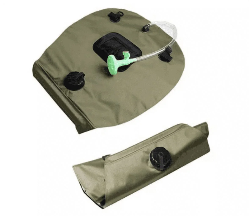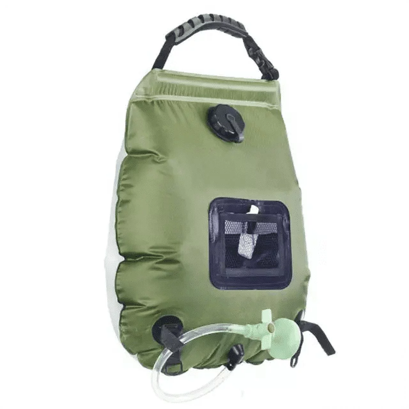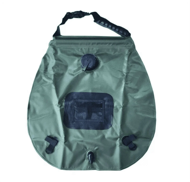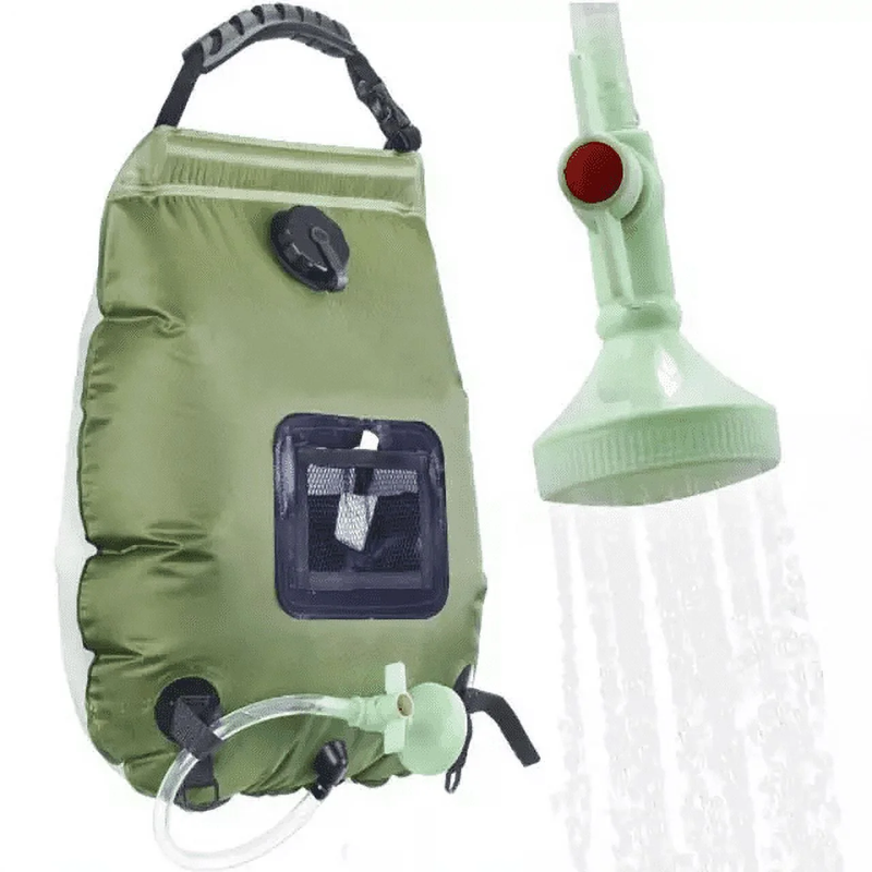 RadBizz Portable Outdoor Camping Shower 5 Gallons, 20 Liters Solar Camp Shower Bag. Take your shower with you anywhere with this shower bag. Whether you're hiking, camping, or going to the beach, this portable shower can go with you. Green in color, the 20 liter shower bag can provide you with quite a long shower. Simply fill the bag, hang the bag in the sun, check the temperature gauge and shower whenever the water reaches a temperature of your liking.