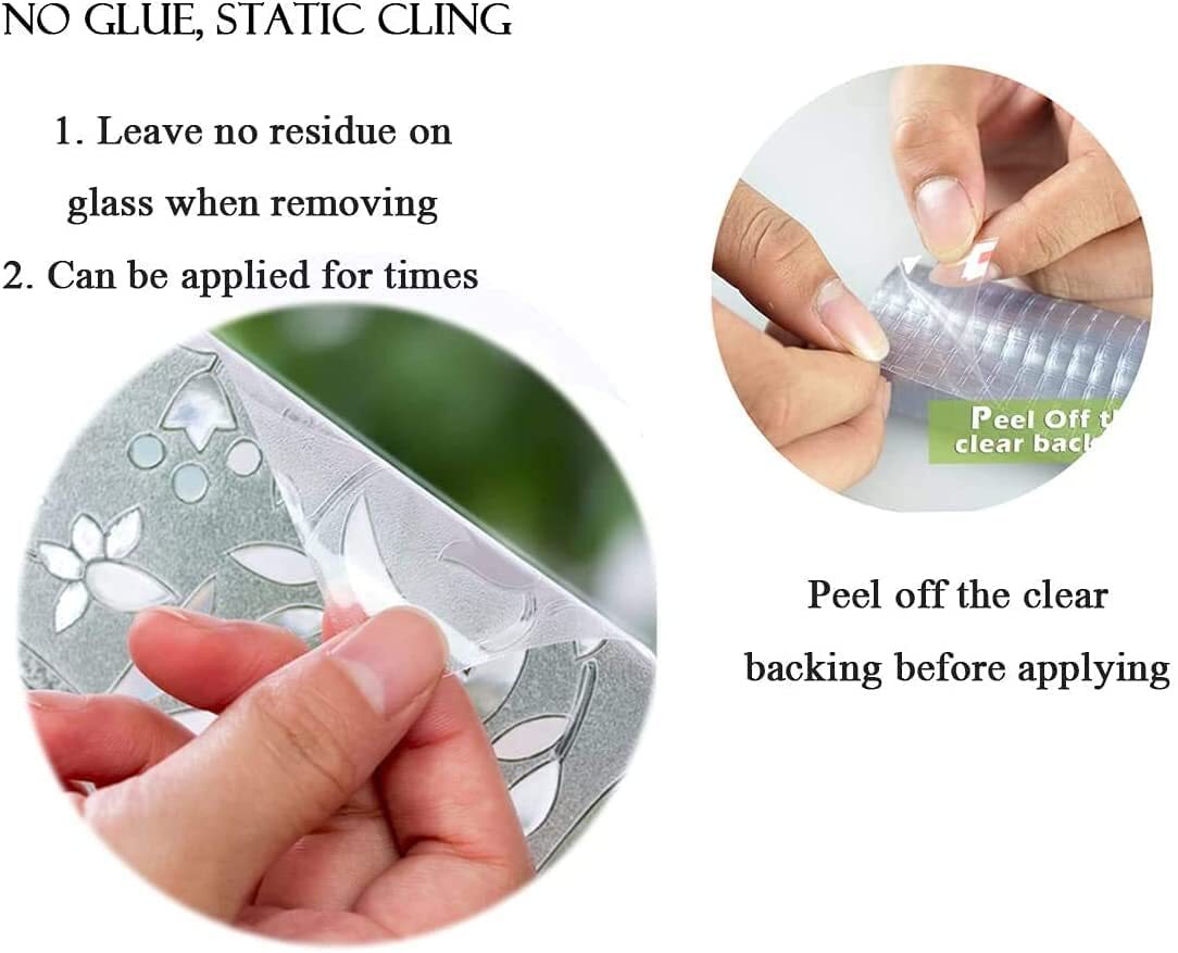 Static cling film no adhesives needed, removable and reusable. Can be trimmed or combined to fit any size window,3D window film. Features a decorative pattern to your windows when the sunshine past through,CREATE PRIVACY:Peep-proof protection film. Heat insulation is prevented bask in. Block more than 96% of harmful ultraviolet rays, protect the physical health,Ideal for using on the shower/bedroom/kitchen/office windows, sliding glass doors, glass cabinet panels, kids room etc,Available in 29.5-inch(Width) by 118-inch(Length) /roll. "How to choose the size"--Please measure the window first. If your window is 36 inches wide and 78 inches long, you only need to buy a roll of 35 inches * 78 inches window film, which is the best choice