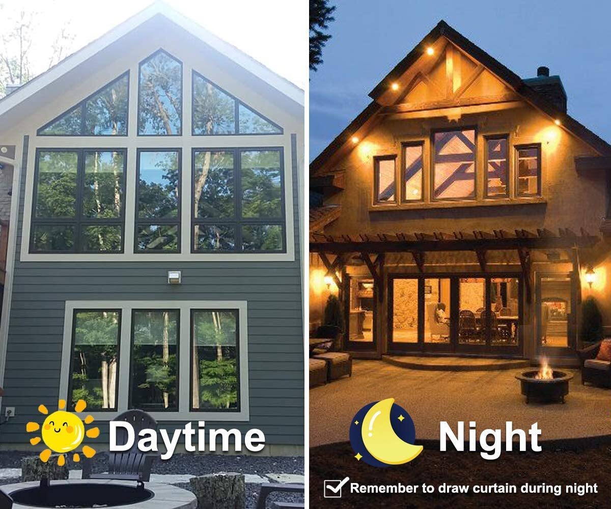 Daytime Privacy Protection- This reflective window film can only provide great privacy during the daytime, because the exterior glass will create a mirror effect when the light outside is stronger than the light inside. Note: At night, the mirror effect is reversed and people can see the interior from the outside, so remember to draw the curtains at night,Easy to Install- This self-adhesive window film with flimly glue, very easy to install and remove, only use a Lot of water on the glass surfaces to paste, and can be easily removed by peeling from the corner and spraying plenty of water, leaves no residue, do no damage to your glass,UV Blocking- Blocks 95% of harmful ultraviolet rays, softens strong sunlight. Protect your skin and allows you to enjoy sunshine in peace. Also prevent furniture from fading,Heat Insulation- This heat control window film can help to keep warm in winter and block out heat in summer,Widely Application- Suitable for using in Office, Gym, Home, Mall, Rental Apartment, and more