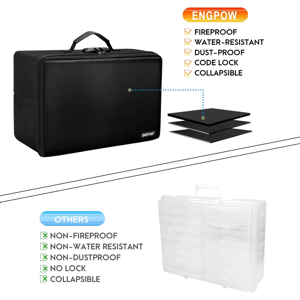 Fireproof and Water-resistant(5" x 7" Photo Cases included) : Fireproof photo storage box is made of double layered non-itchy silicone coated fiberglass which stands up the temperature up to 2000?. Fireproof photo storage box is not only fireproof but also high water resistant in case it gets wet for any reason.Nothing is completely foolproof, but added protection is always a good idea. 16 Inner 5" x 7" photo boxes (clear) can organize and store your important photos,valuables and more.,Large capacity: 16.34 * 10.63* 6.7 inches,the perfect solution to Organize Store photographs,craft Supplies,important pictures,scrapbook,important documents and office supplies. A zipped pocket on the flap gives you more storage space.Includes 16 of the 5" x 7" photo cases, each case holds 100 photos, holds up to 1600 5" x 7" photos, convenience to use and take with. The Non-dusty material can prevent dust from sticking to the outside of our fireproof photo box, always keep it neat and tidy.,Portable and secure: High quality combination lock design for added storage security, includes instruction manual for combination lock. High quality PVC boards won't warp and it can hold a minimum of 150 lbs. Sturdy handle makes it easy to carry everything you need, two zippers make it easier to open and close the box. More wider strap handle design on the back allows you to insert a suitcase handle. The photos organizer case collapses down simply for easier storage when not in use.,Wide Range of Applications: Combining a fireproof photo box and other ENGPOW fire protection products (All have passed SGS TEST)together is the best solution to offer your photos and valuables a complete protection in any fire accident.Not only can you put the photo box in your home, office, car, fireproof safe, storage cabinet, you can also take it to camping, travel and various outdoor activities. Of course, giving it as a gift to your family, customers or employees is also a good choice.,TRUSTED AFTER SALES SERVICE :How can we better protect our valuables from any fire? ENGPOW keep researching and developing on fireproof materials,safety technology.We only wish to present the best to customers,to protect your valuables.If there any quality problem, please feel free to let us know.We promise to arrange a REPLACEMENT or 100% REFUND immediately....