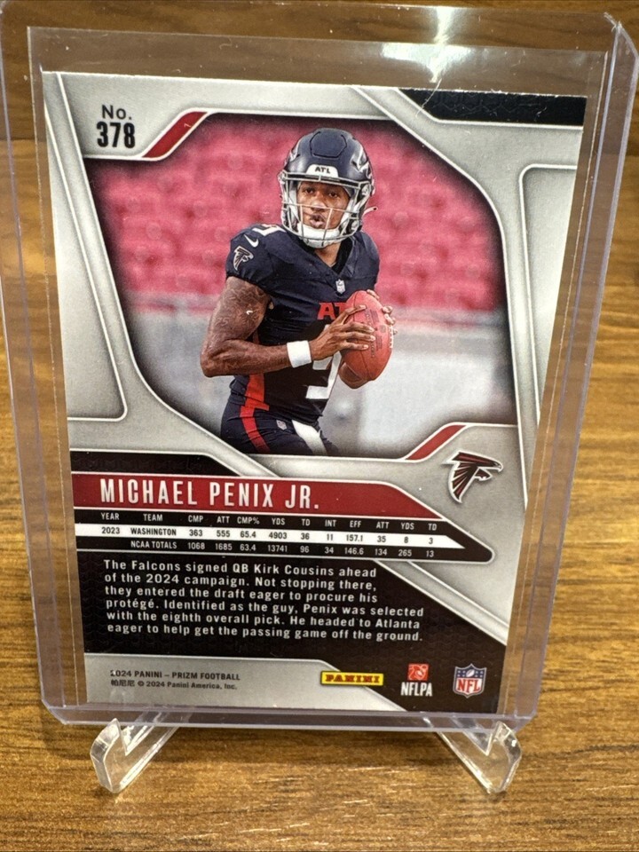 The 2024 Panini Prizm Rookies Michael Penix Jr. #378 Prizm (RC) trading card is a highly collectible sports memorabilia item featuring the rookie player from the Atlanta Falcons, Michael Penix Jr. This original card manufactured by Panini is made of sturdy card stock with a thickness of 20 Pt. It is part of the 2024 Panini Prizm set and belongs to the National Football League (NFL) league. With the features of being a part of the base set and being a parallel/variety card, this trading card is a must-have for football fans and collectors looking to add a valuable piece to their collection.