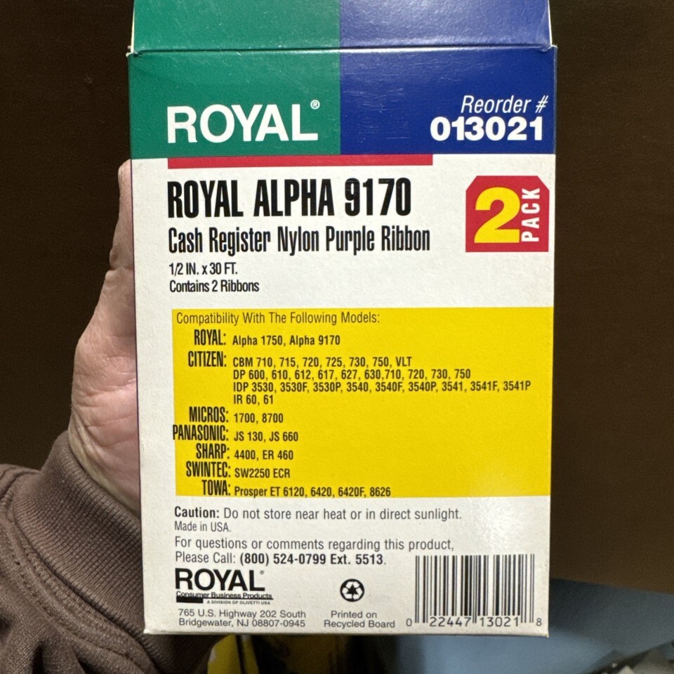 The Royal Alpha 9170 POS Printer Ribbon is a high-quality, unbranded ribbon designed for use with the Royal Alpha POS cash register. Made in the United States, this ribbon is compatible with the Royal Alpha 9170 model, ensuring a perfect fit and reliable performance. Ideal for businesses in the retail and services sector, this POS printer ribbon helps streamline transactions and maintain accurate records at the point of sale.