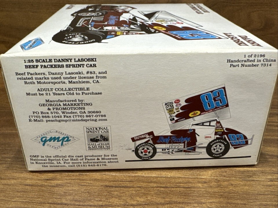 The Danny Lasoski #83 Beef Packers Sprint Car is a 1:25 scale diecast model, part of the limited edition series by GMP. This multi-color car features special edition details and is targeted towards collectors aged 21 years and up. Made of diecast material in China, this collectible vehicle is a must-have for fans of cars and racing memorabilia.