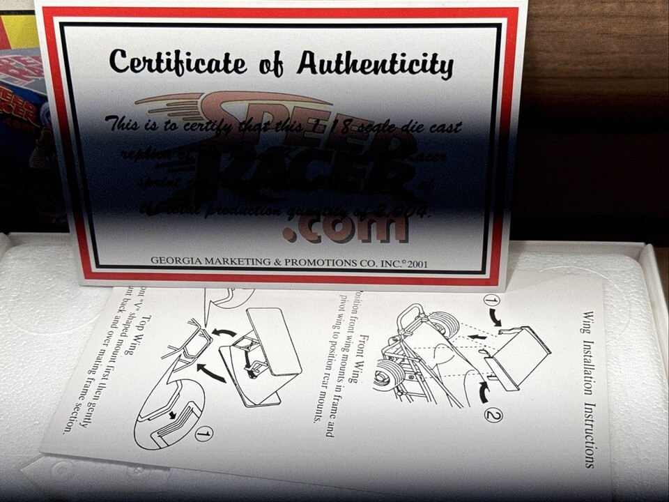 This car looks as if it was really never out of the packaging. I opened it up so you could see what it looks like inside. The wing is still wrapped from the factory, same with the front wing. The paper over top of the main car shows as it has been lifted up like I did in the picture. Other than that, this thing is in cherry condition. Please look at my photos and ask questions before purchasing.