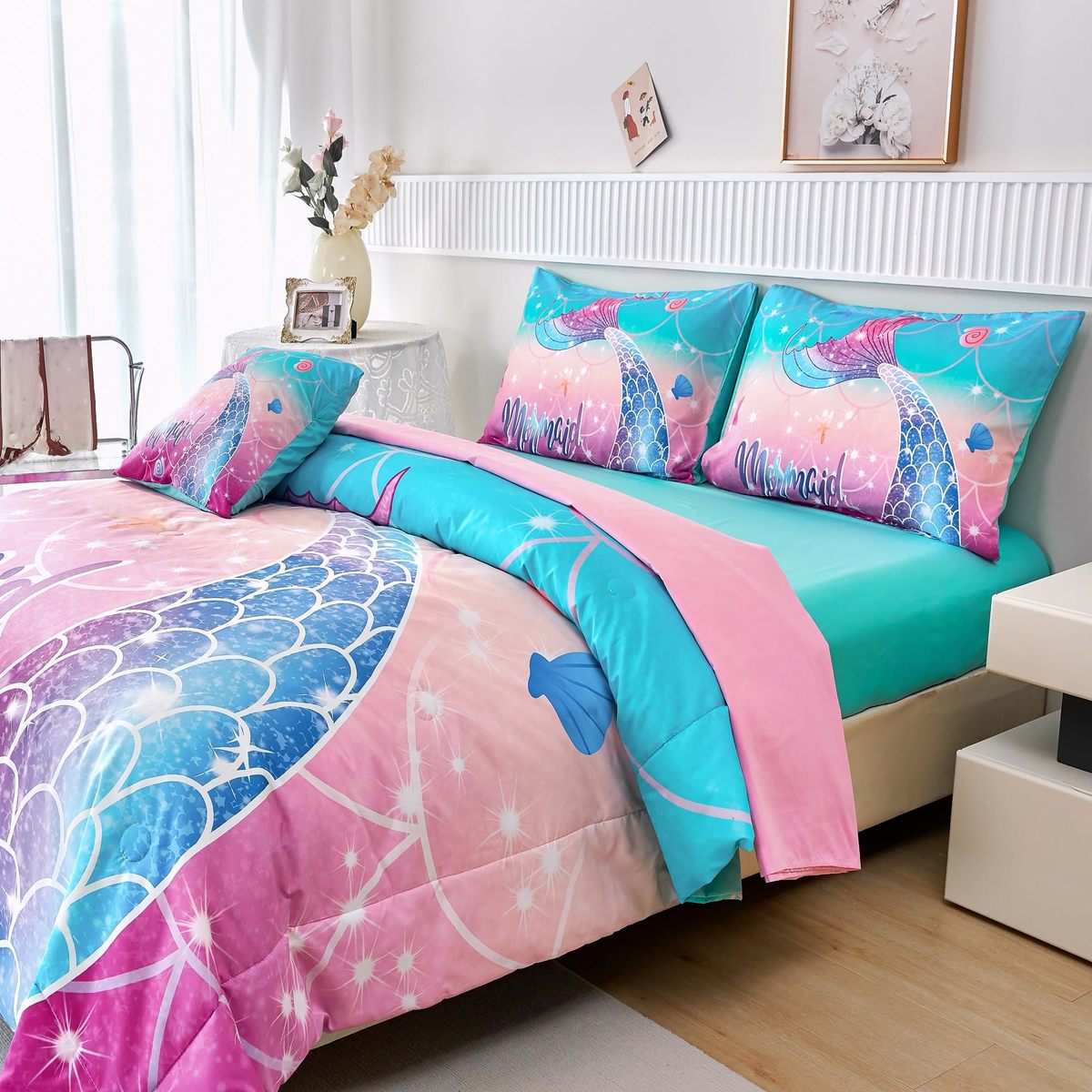 RYNGHIPY Girls Mermaid Full Comforter Set 6pc Fish Tail Bed in a Bag