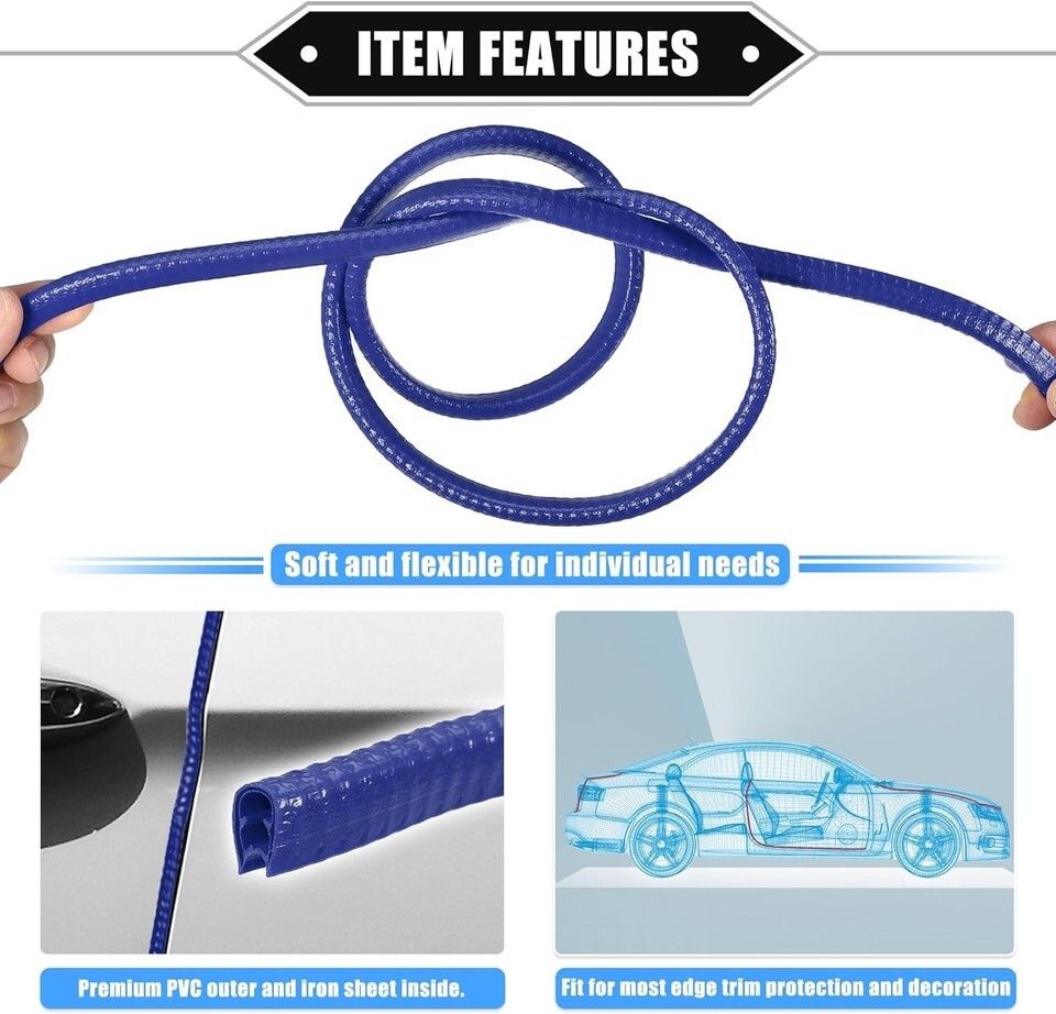 Car door edge guard strip is made of good quality PVC and iron material. Length: 5m / 196.85" / 16.4ft; Width: 10mm / 0.39" / 0.03ft; Thickness: 7mm / 0.28" / 0.02ft. Good resistance to high or low temperature.