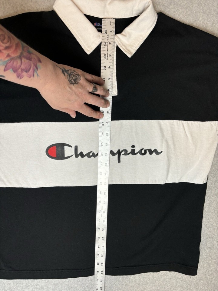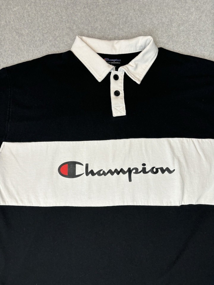 Champion Men's Powerblend Rugby Polo Short Sleeve Tee Shirt Black and white Size Large