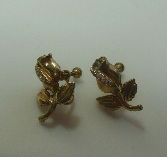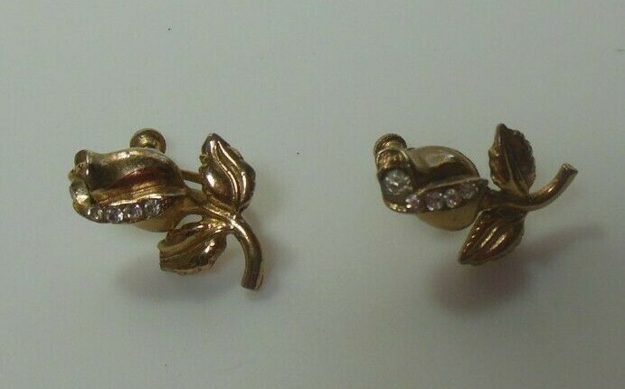 Vintage Signed Karu Rose Flower Rhinestone Screw-back Earrings