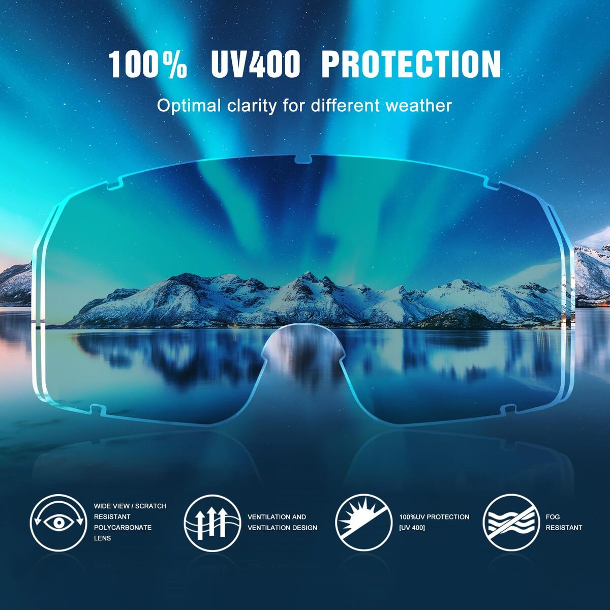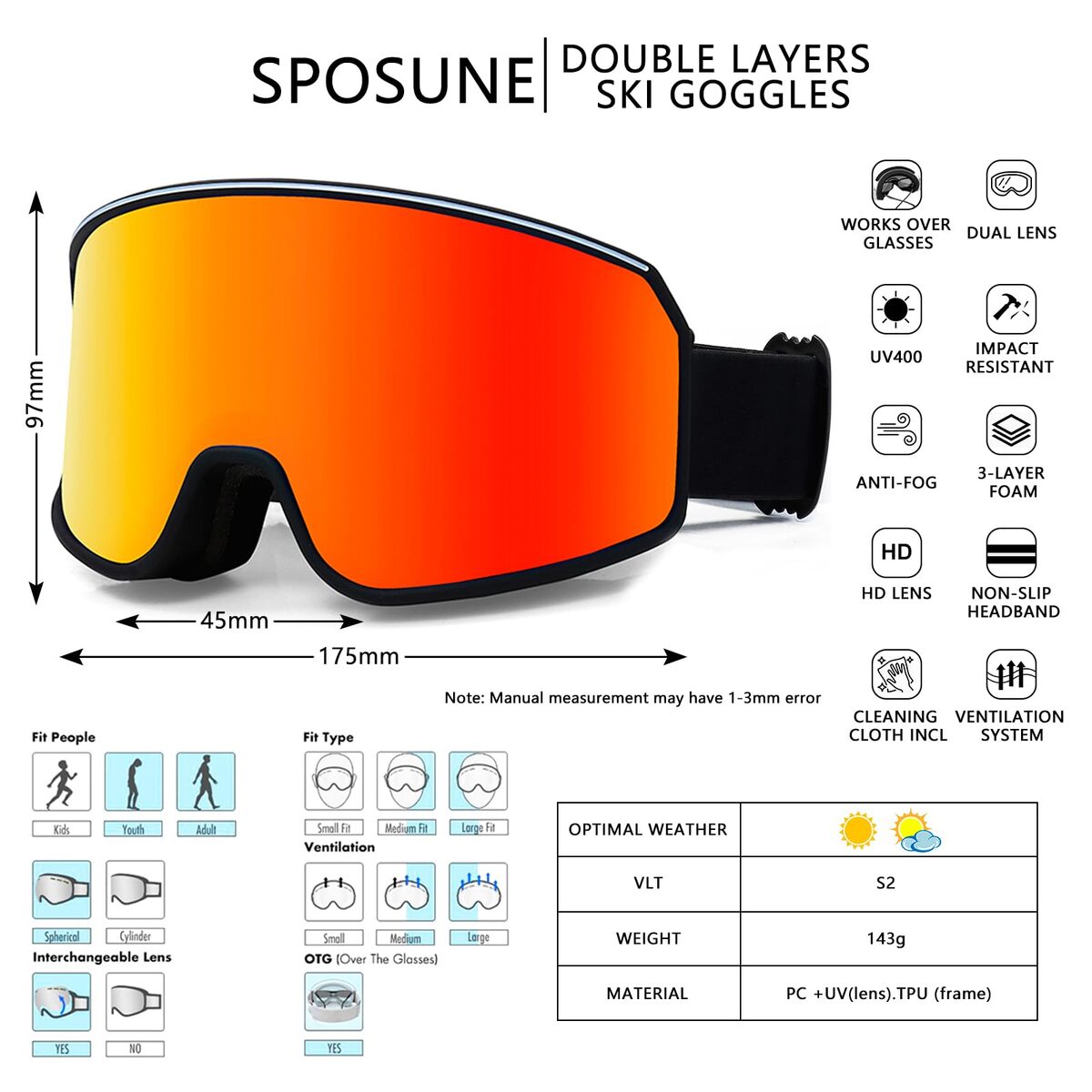Description Experience ultimate clarity and protection with SPOSUNE Dual Lens Ski Goggles. These goggles feature UV400 protection, shielding your eyes from harmful sun rays. The anti-fog technology ensures clear vision in any weather conditions, while the dual lens design enhances visual clarity. The thick foam padding and adjustable strap provide a comfortable and secure fit for hours of skiing. Whether you're hitting the slopes or snowmobiling, these ski goggles are designed to meet your needs. Upgrade your skiing experience with SPOSUNE Dual Lens Ski Goggles today. Specification: Eyewear Colors: Bright Black, Bright White Eyewear Type: Professional Skiing Eyewear Lenses Attribute: UV400 Protection, Anti-fog, Anti-reflection, Double layer lens, Mirror Coating Lens Width: 6.69 IN Lens Height: 3.54 IN Weight: 4.12 oz Frames Material: TPU Lenses Material: PC+CA Package includes ยท1 * Ski Goggle ยท1 * Goggle Bag Friendly Notice: Please tear protective film inside when using. There will be color differences in different angles of view because of Mirror Coating. Please do not use mascara or other oily substance in case lens gets dirty. Please air-dry the goggles after every snow sport e.g. skiing, snowboarding and etc. Please do not wipe the inner lens which will invalidate anti-fog function.