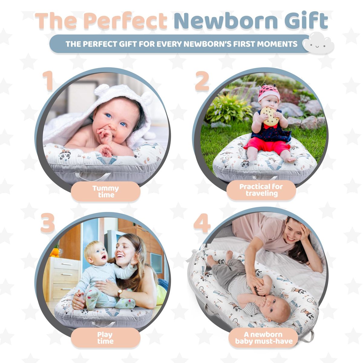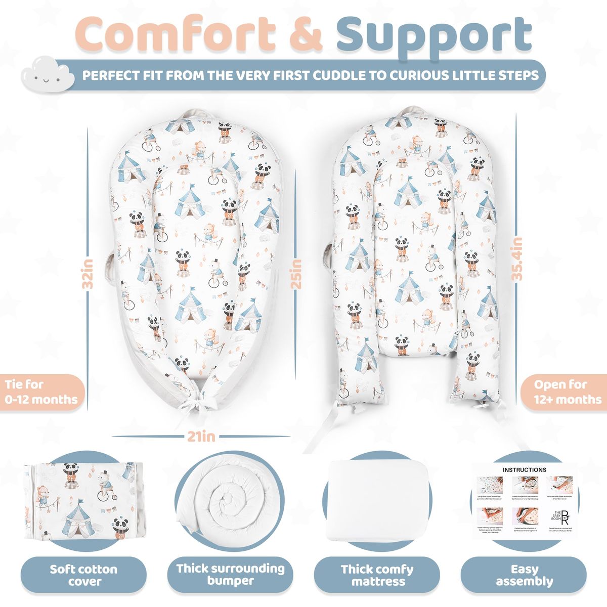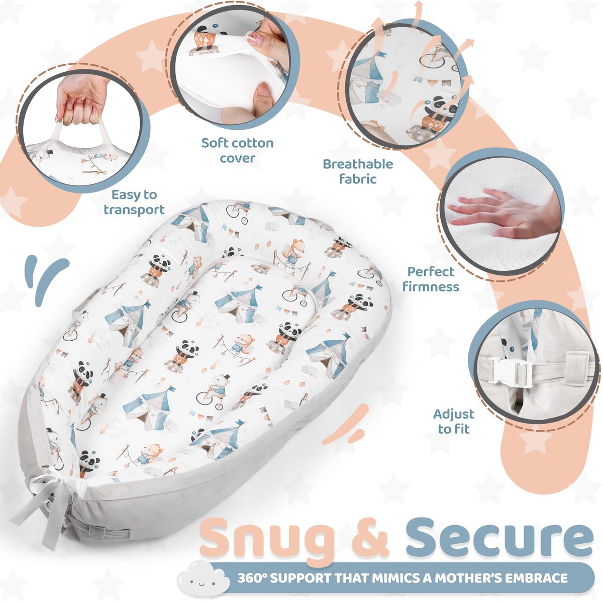 The Baby Room's baby lounger nest offers exceptional comfort and safety for your newborn, certified by CPC, ASTM, and CPSIA after rigorous third-party testing. Itas ultra-soft, breathable, and cooling, creating a safe, skin-friendly environment for your baby to rest peacefully. The lounger features a 360-degree bumper for added security, and its unique design supports spinal and head development. Perfect for both home and travel, it comes with two easy-to-carry handles and a removable, washable cover that stays soft and breathable through multiple washes. Adjustable to grow with your baby from 0-24 months, itas an essential, low-cost investment and an ideal gift for new parents. The double-sided design offers a plush velvet exterior and a smooth, cool interior for added comfort. Delivered in a vacuum-compressed package, the lounger quickly regains its shape, and to maintain its quality, we recommend air-drying the cover.