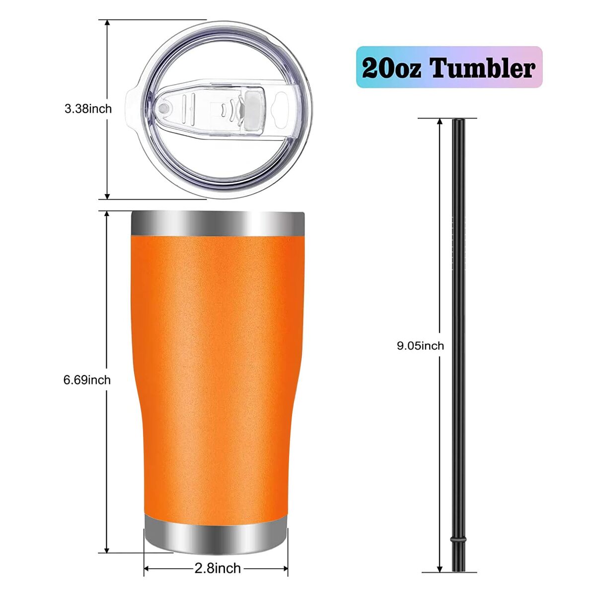 Stainless Steel Tumbler with Lid and Straw: Made of food grade stainless steel .No metallic taste, the lids uses BPA FREE plastic which is completely nontoxic,Double-walled Coffee Tumbler: Double-walled stainless steel body ensure that it is incredibly good at temperature protection. Under normal temperature, the insulated coffee cup keep your water hot for three hours and cold for nine hours,Colored Powder Coated Tumbler: Powder coating gives you multiple color options, make an impression on your lucky recipients. have a sweat-proof Design to make sure your hands stay dry,20oz Coffee Tumbler: The 20 ounce drink tumblers? body height is 6'6,the Drink through lid diameter is 3'4 . It fits most car cup holder and ideal for use over a long period of time. Perfect for all-day outdoor events, conferences, business trips,commute and the like,20oz Tumbler: The coffee tumbler suitable for parties, picnics, self driving travelling, boats, beach, pool, camping and hiking, etc.This 20oz tumbler is a practical gift for your friends, families