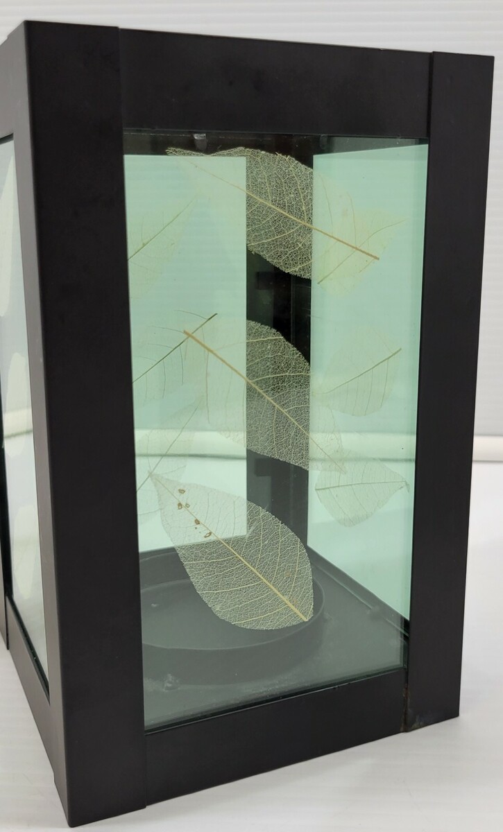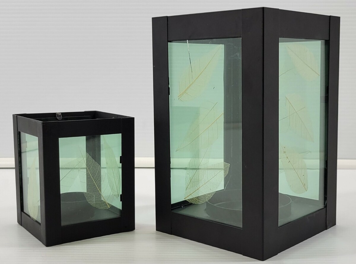 2 Black Lantern Metal Leaf Tea Pillar Candle Holder Cube Glass Boxes