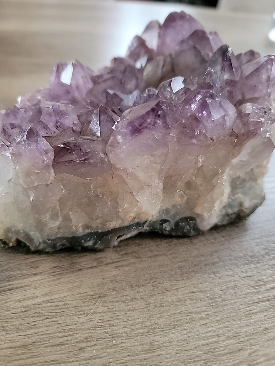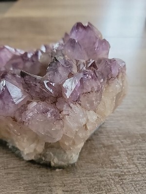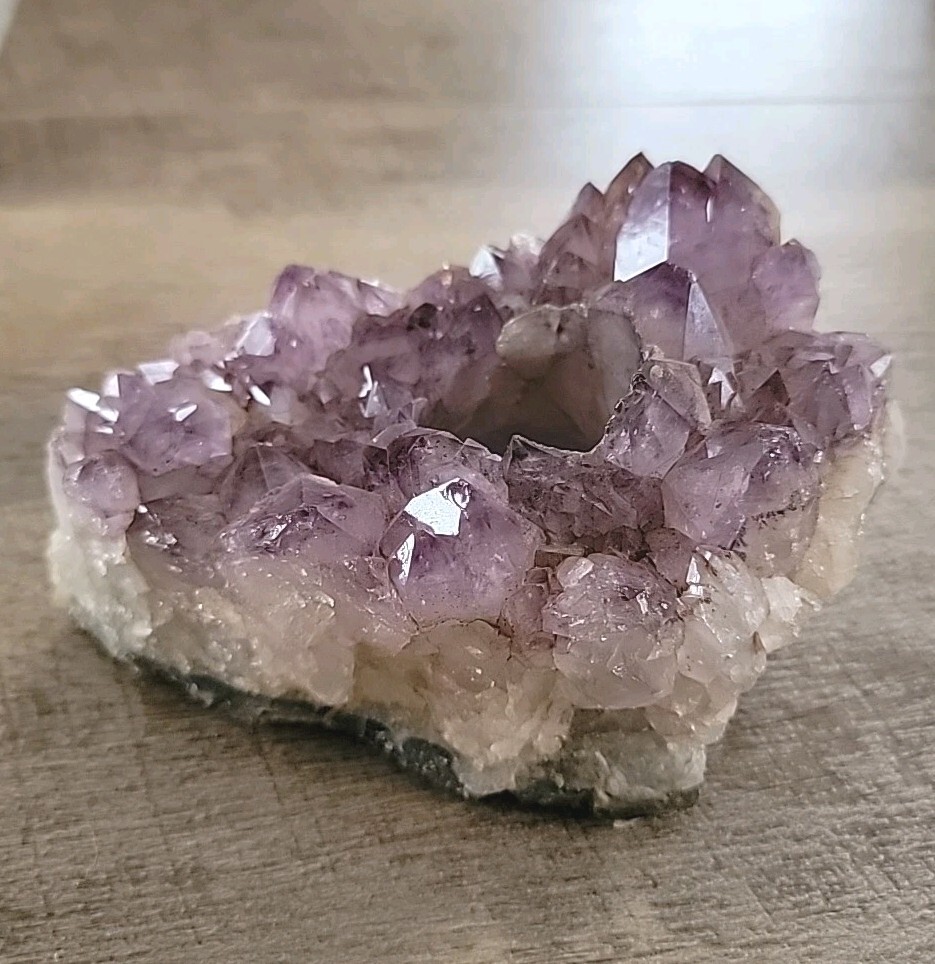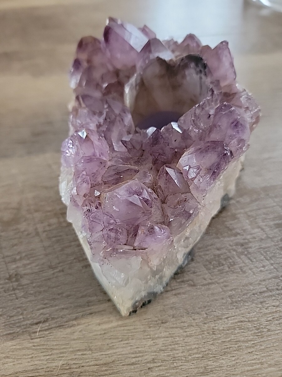 This product is a unique tea candle holder made of a natural amethyst geode cluster, originating from Brazil. The holder measures 6 3/4" in length with a 1 1/2" center votive, making it a striking and colorful addition to any space. The purple hues of the amethyst crystals add a touch of elegance and natural beauty to the design, making it a desirable collectible for those interested in crystals and mineral specimens. This weighs 3 lb and is very pretty