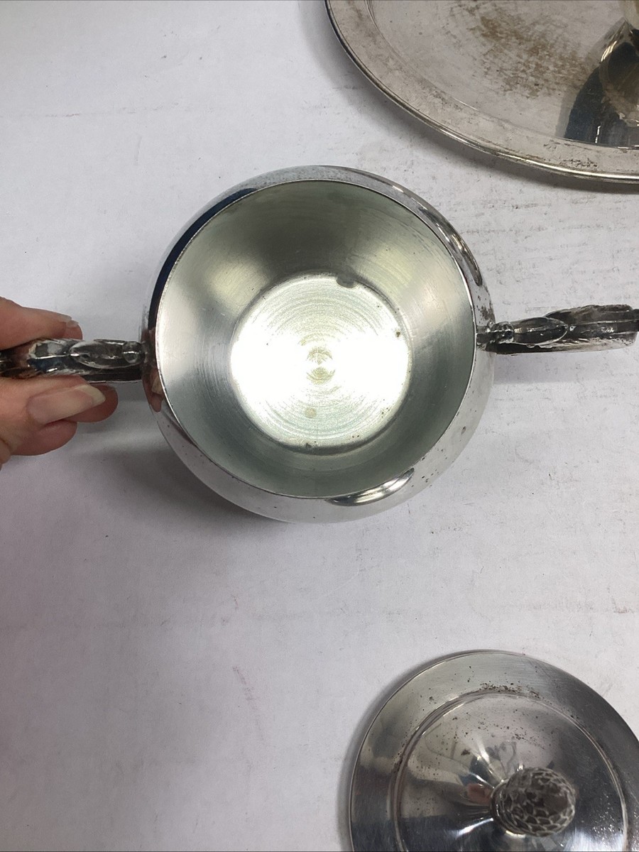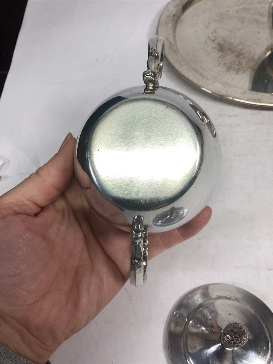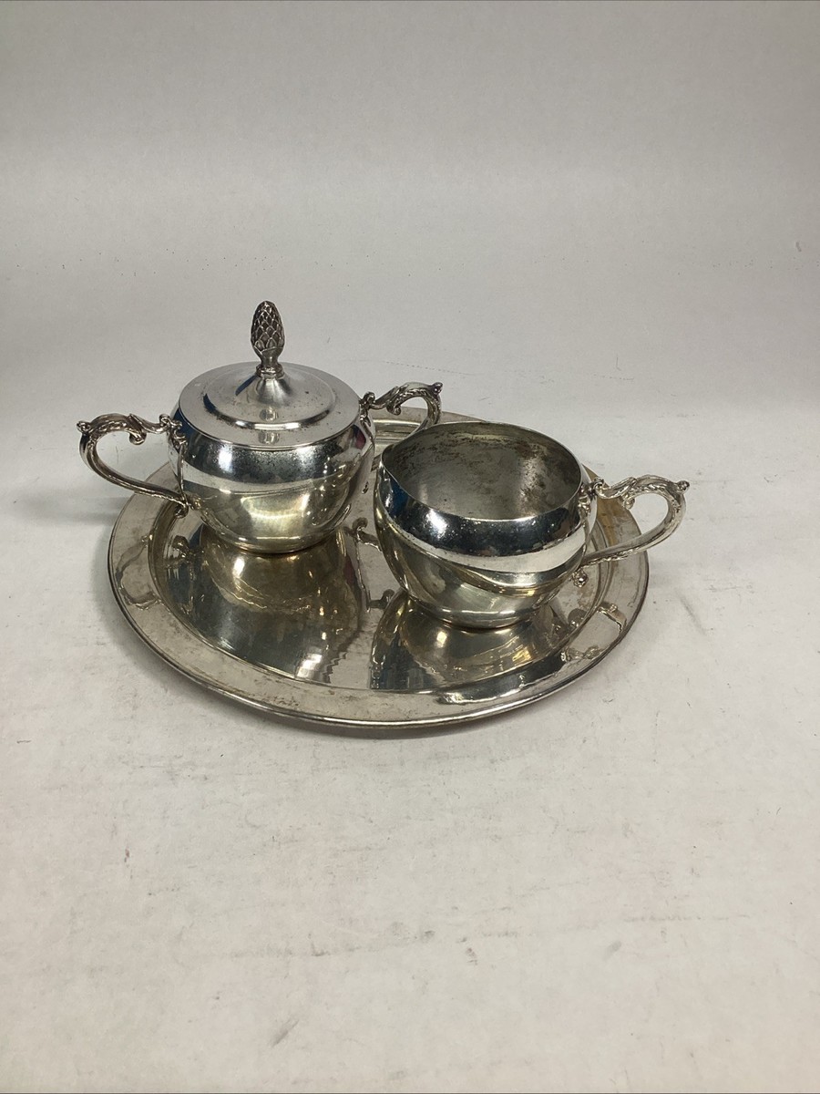 Vintage Leonard Silverplate Lidded Sugar and Creamer Set Pineapple Top Shiny. Set of 3. Creamer measures 4.5x3.75x2.25?. The sugar measures 5x2.5x4?. The plate/holder - not sure if it?s the same brand but on the base it has a tag that says Made in India. The plate measures 8.5?D. All in used condition and have some marks and spots on them. Will need a good cleaning and polishing. Selling as is.