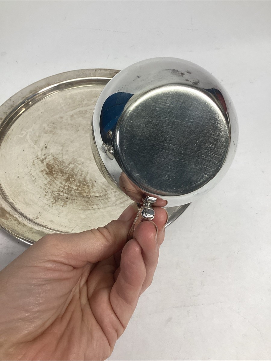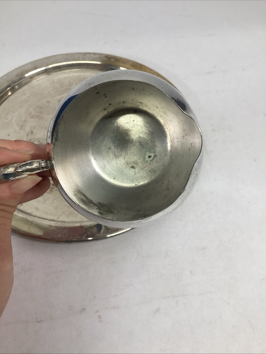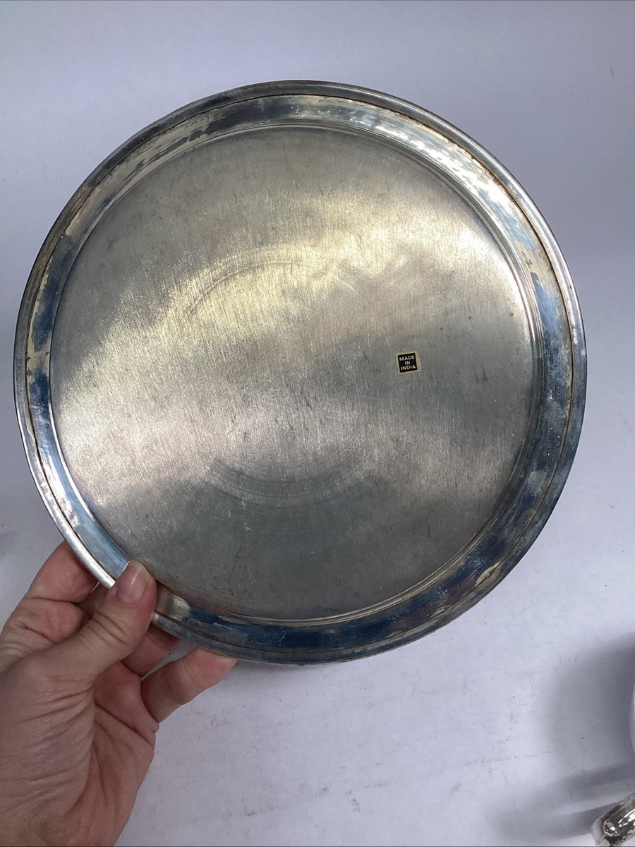 Vintage Leonard Silverplate Lidded Sugar and Creamer Set Pineapple Top Shiny. Set of 3. Creamer measures 4.5x3.75x2.25?. The sugar measures 5x2.5x4?. The plate/holder - not sure if it?s the same brand but on the base it has a tag that says Made in India. The plate measures 8.5?D. All in used condition and have some marks and spots on them. Will need a good cleaning and polishing. Selling as is.