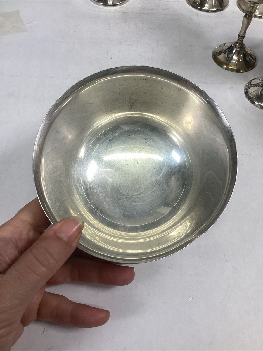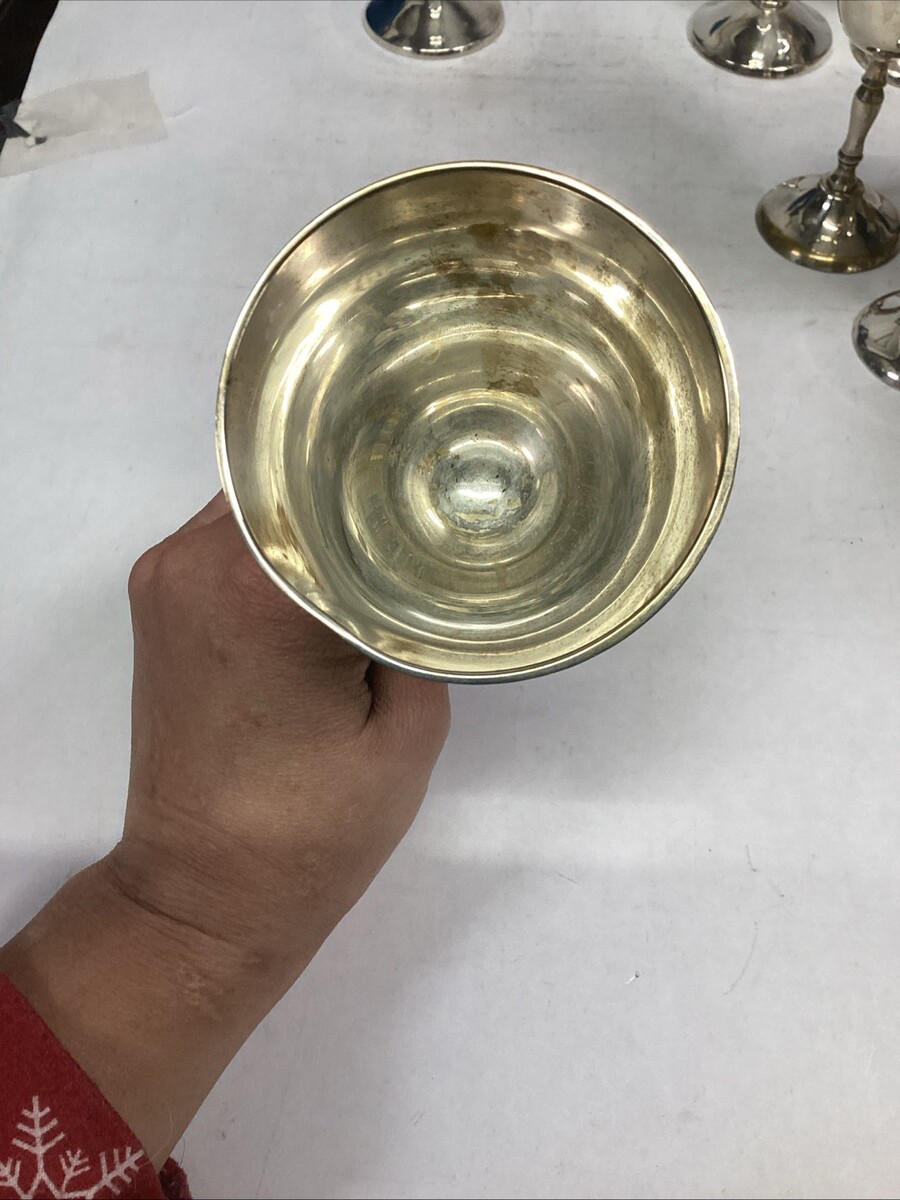 There are 4 smaller ones which measure 5.5?Hx2 3/8?Dx2.75? Deep and each weigh 5 ounces each. These are also somewhat tarnished and have some goldish tones as well. Also has some spots and these need a good cleaning and polishing too