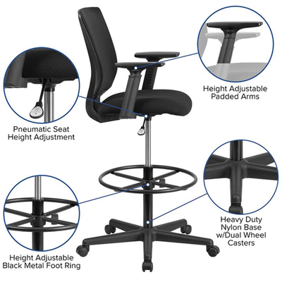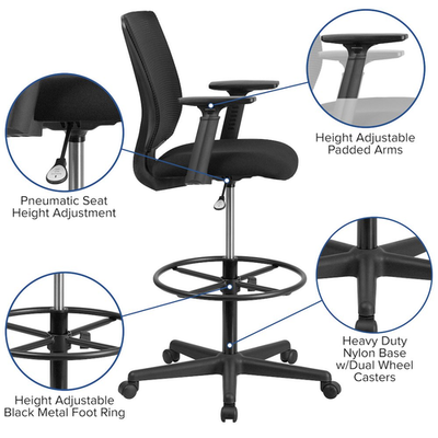 Mid Back Mesh Drafting Chair Black Fabric Seat Adjustable Foot Ring