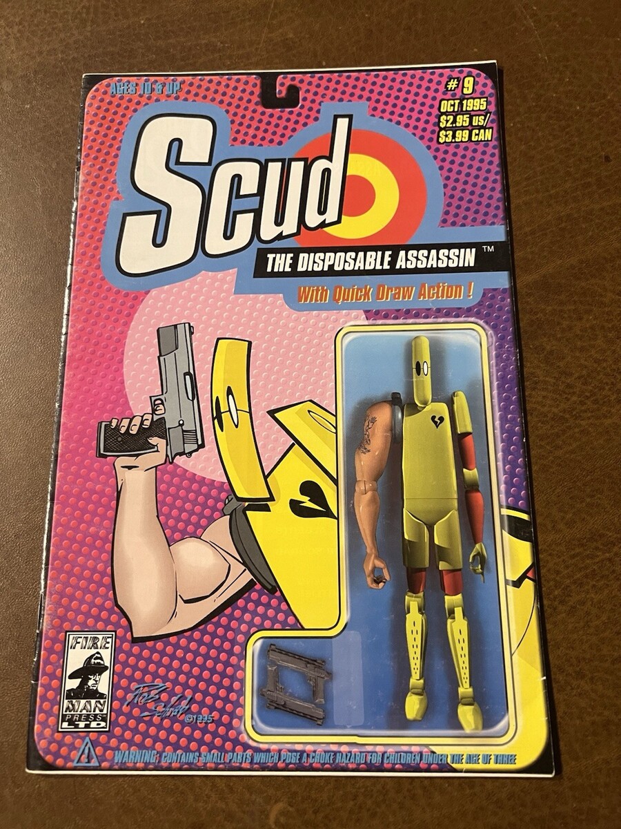 The Scud the Disposable Assassin #9 1st Action Figure Variant comic book, published by Fire Man Press in 1995, features artwork by Dan Harmon. This vintage collectible from the US Comics tradition follows the series title, Scud: The Disposable Assassin, in a modern age adventure genre. With a single unit for sale, this first printing comic book is a must-have for fans of assassins and action heroes, making it a valuable addition to any comic book collection.