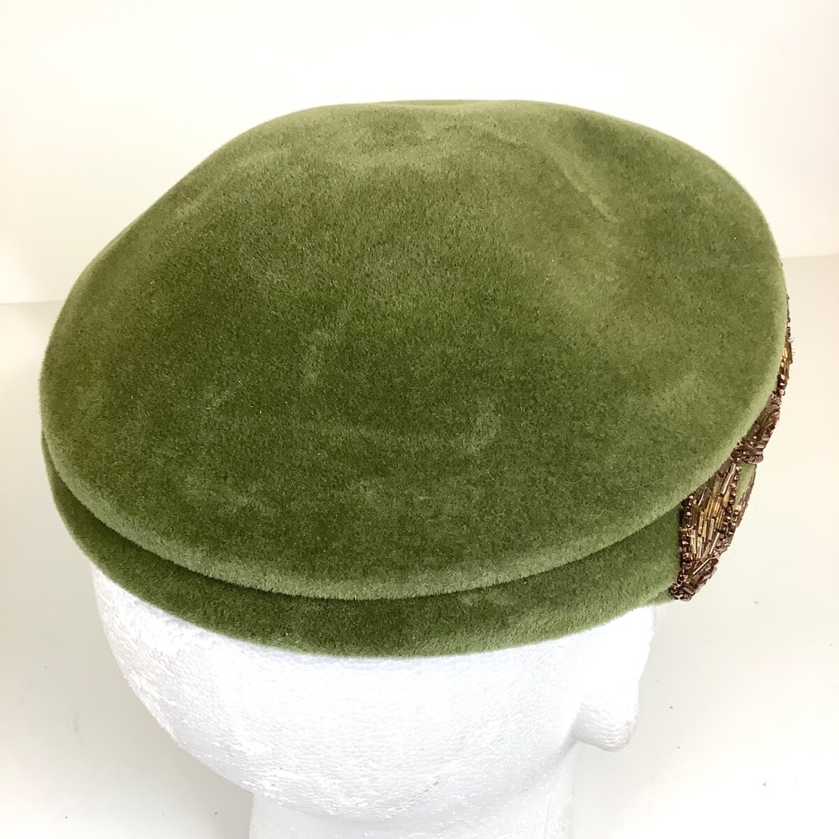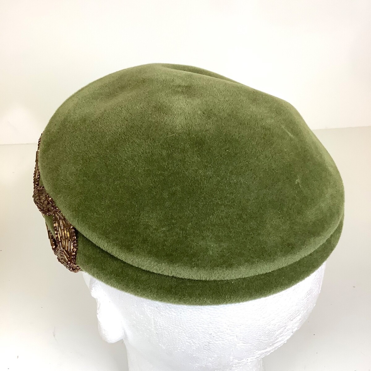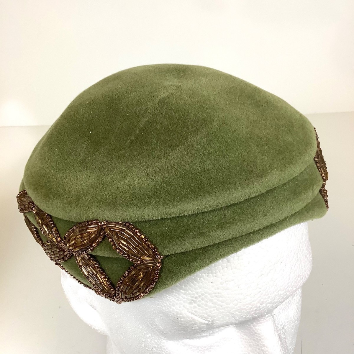 Vintage 1950s Green Velour Beaded Jan Leslie Custom Design Hat Made in France. Overall, good condition. Could use some shaping to get it back into its original shape. Please see all photos.