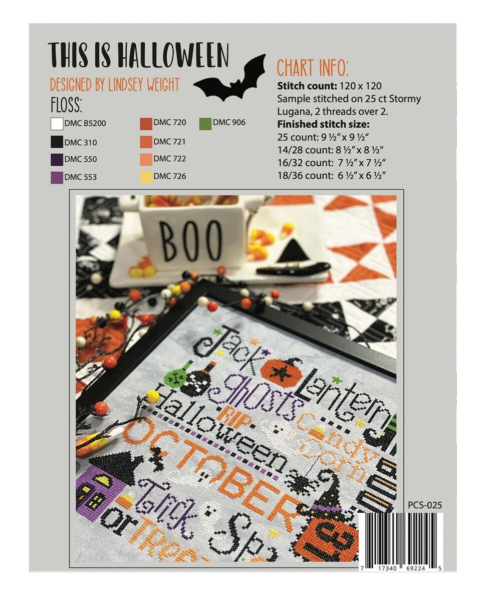 This is Halloween Cross Stitch Pattern. This Is Halloween Cross Stitch. Designed by Lindsey Weight. Stitch Count: 120 x 120 stitched on 25 count Stormy Lugana, two threads over two. Printed Paper Pattern. Skill Level: Confident Beginner. Stitch Count: 120 x 120. CHK-PCS-025