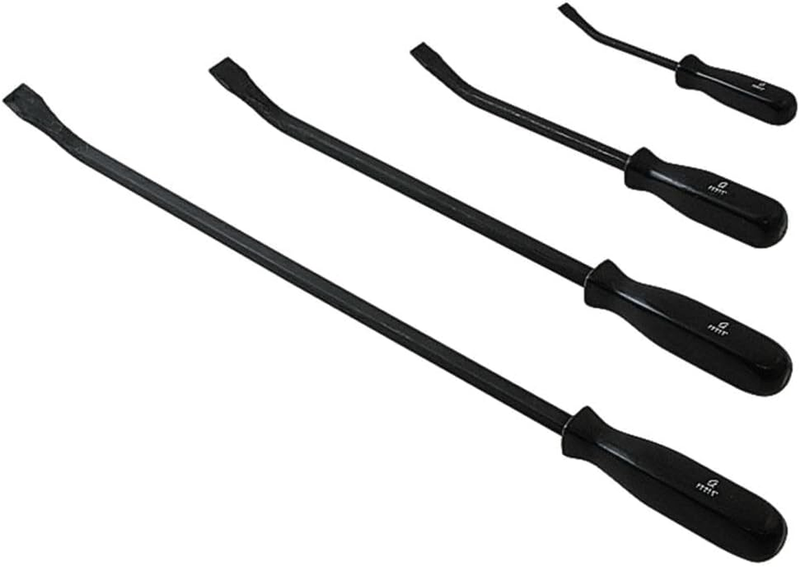 This pry bar set is made of heat treated alloy steel and features a comfort grip handle and heat resistant cellulose acetate vinyl handle. Ground and polished pry bar blade edges. Set includes (in): 8", 12", 18", 24" sizes.