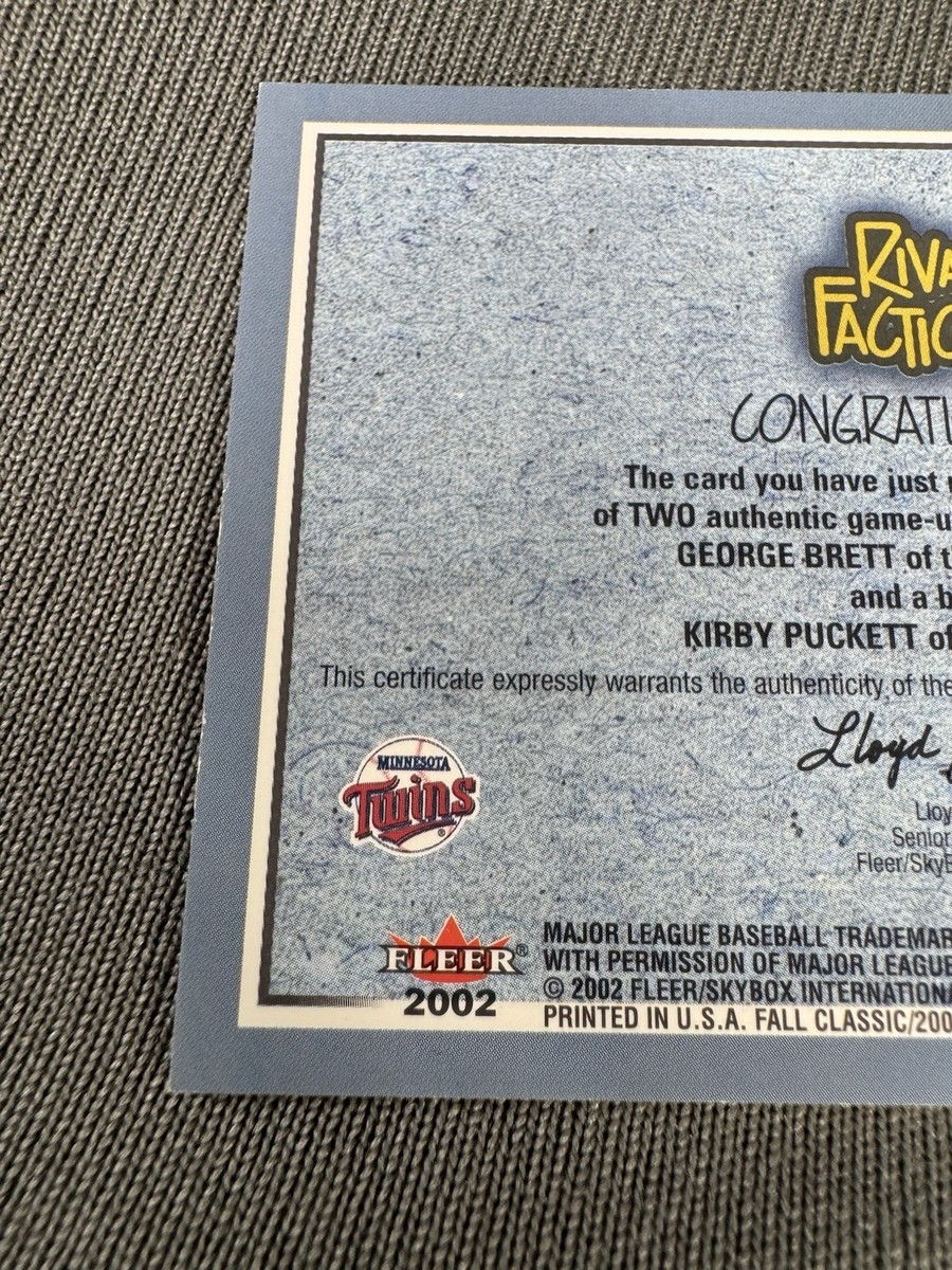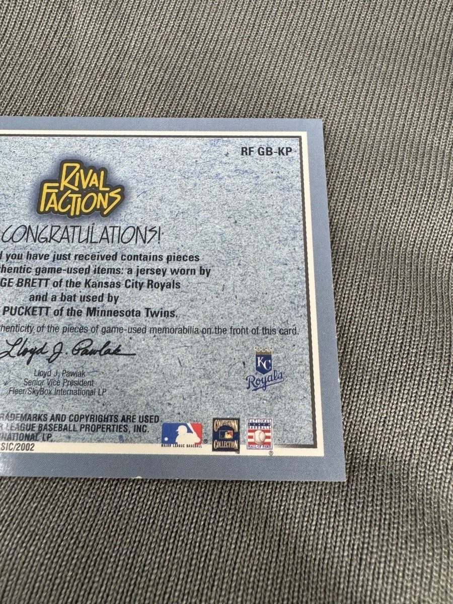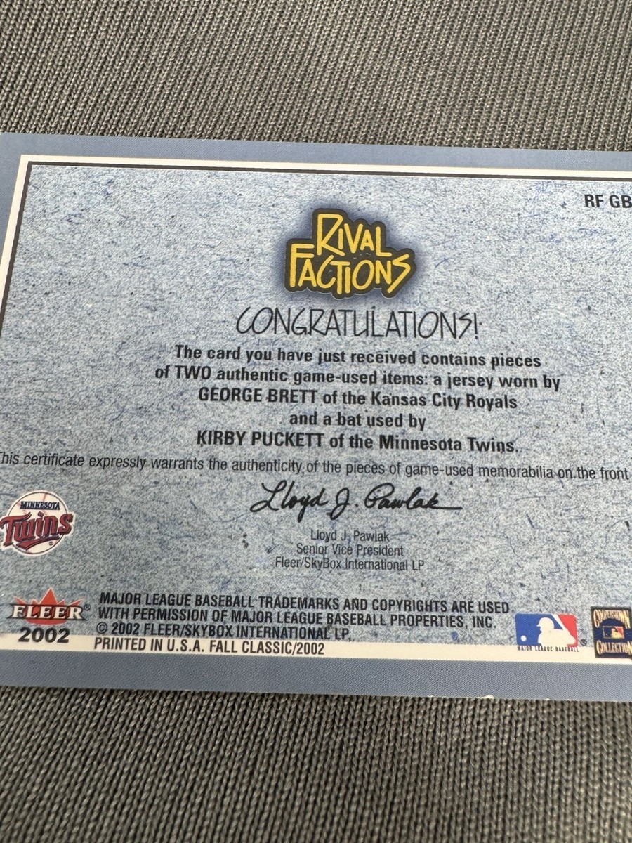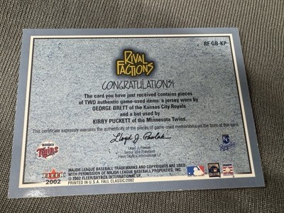 2002 Fleer Rival Factions Game Used Bat Jersey Card George Brett Kirby Puckett
