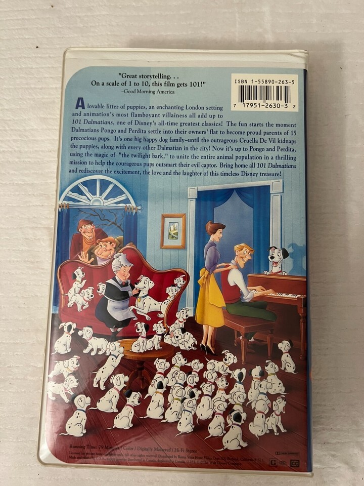 This Walt Disney VHS tape features the beloved classic 101 Dalmatians, with a G rating suitable for all audiences. The tape is a rare find, part of the Black Diamond collection from Walt Disney Home Video. Fans of animation and anime will especially appreciate the timeless story and vivid characters of this beloved film.