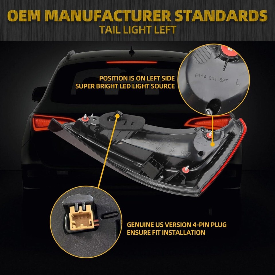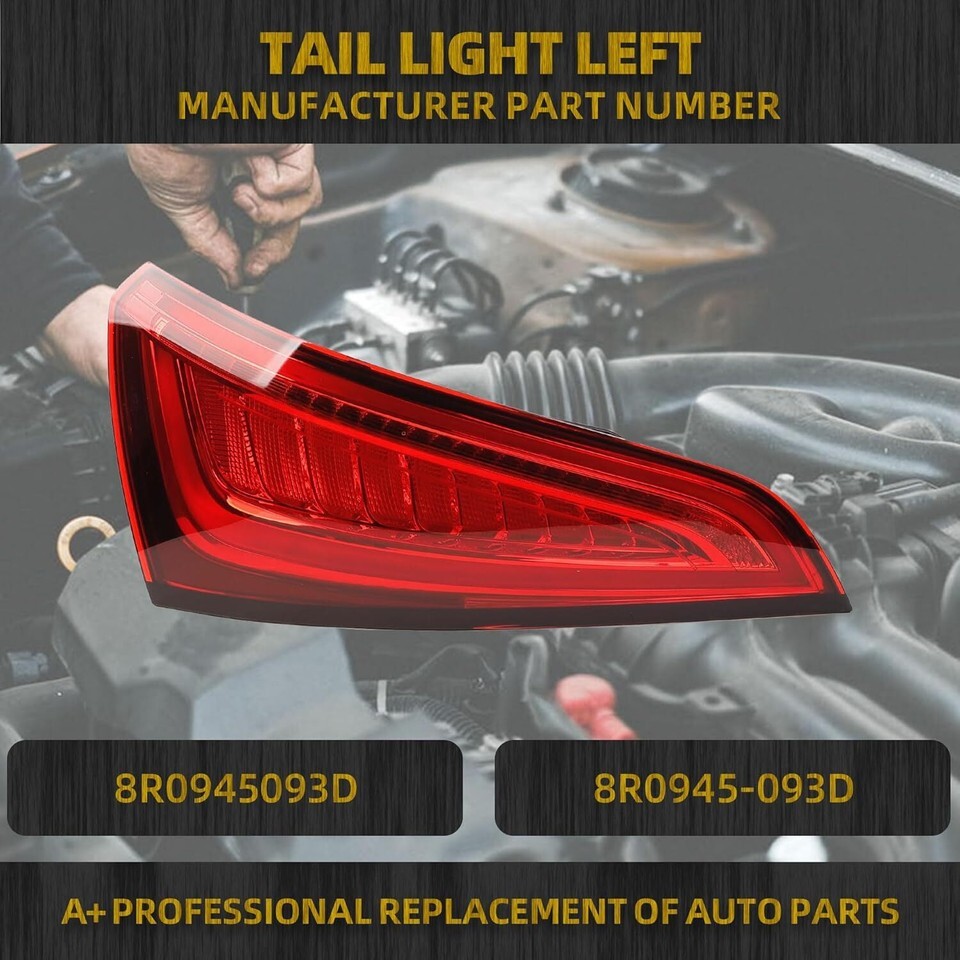 ?Compatible with?The Left Tail Light Assembly Compatible With 2013 2014 2015 2016 Audi Q5 / Q5 Hybrid, 2014-2016 Q5 TDI. ?Replace Number?Driver Side Rear Taillght Replaces# 8R0945093D. Please Confirm Your Vehicle Model And Part Number Before Purchase. ?Advantage?Tail Lamp Len Is Made Of PMMA Plastic,The Same Color As The Car, IP67 Dustproof, Waterproof And High Transparency. Not Prone To Aging, Fading Or Damage. DOT SAE Approval. ?Feature?The Rear Lamp Is Red Turn Signal Light, Comply With Traffic Regulations In the US, Super Bright LED Light Source Enhance Your Driving Safety. ?Easy To Install?Perfect OEM Replacement, 100% Fit, 4-Pin Plug Design to Ensure Installation, Quick To Install, Within A Few Minutes. ?Warranty?12-Month-Warranty, If You Have Any Questions, Please Contact us Via Amazon Message Directly, Our Professional Customer Service will Help.