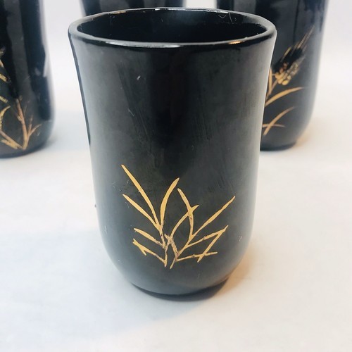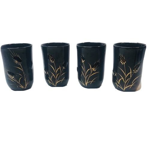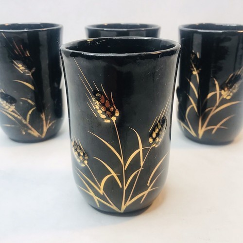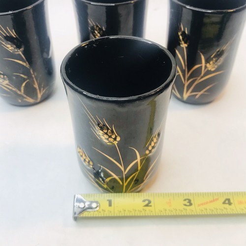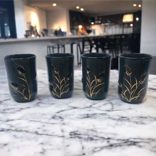 This is a set of 4 stunning mid century modern juice/cordial/shot glasses made of tears cotta with a black gloss finish and designs of raised metallic gold wheat shafts. Awesome addition to your home bar or dishwater collection!