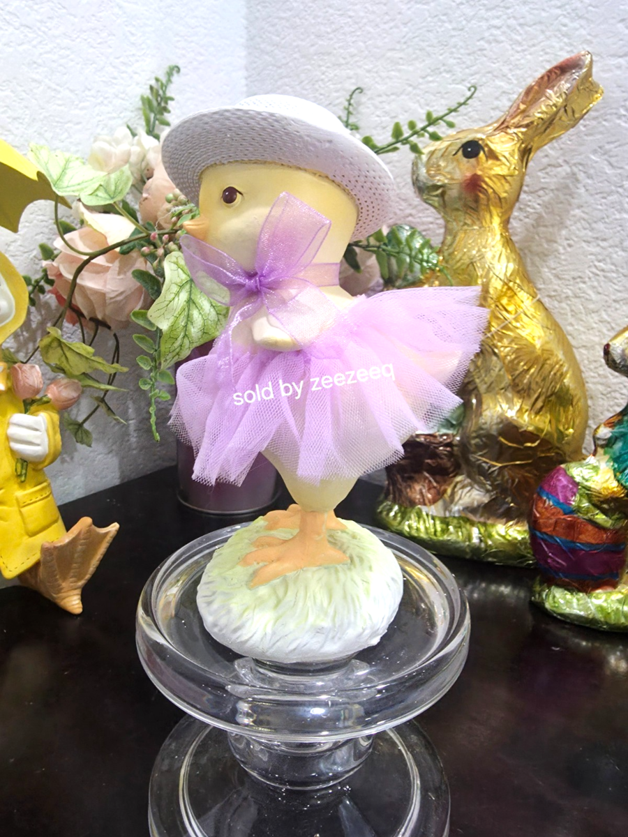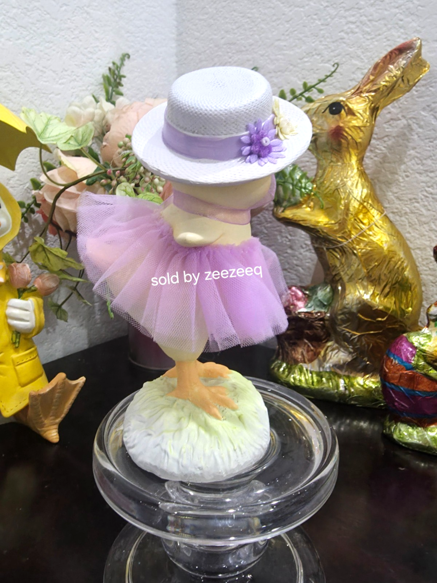 Up for sale are this adorable figurine for your Easter tabletop decor. This piece is soooo cute!! The chick is wearing a lavender tutu dress with a cute floral hat. Made of resin and stands approx 6.25" tall. I slo have one in pink (see last picture) Perfect for a tier tray too! NEW