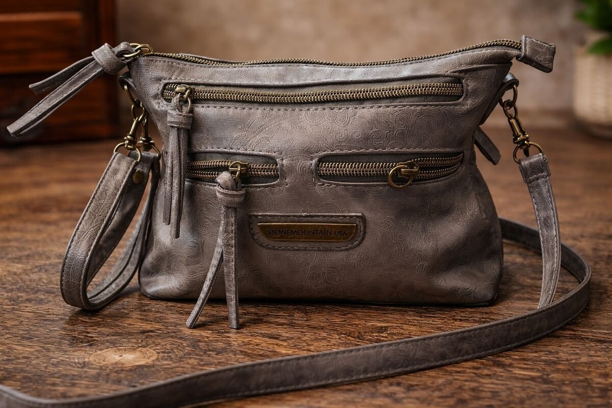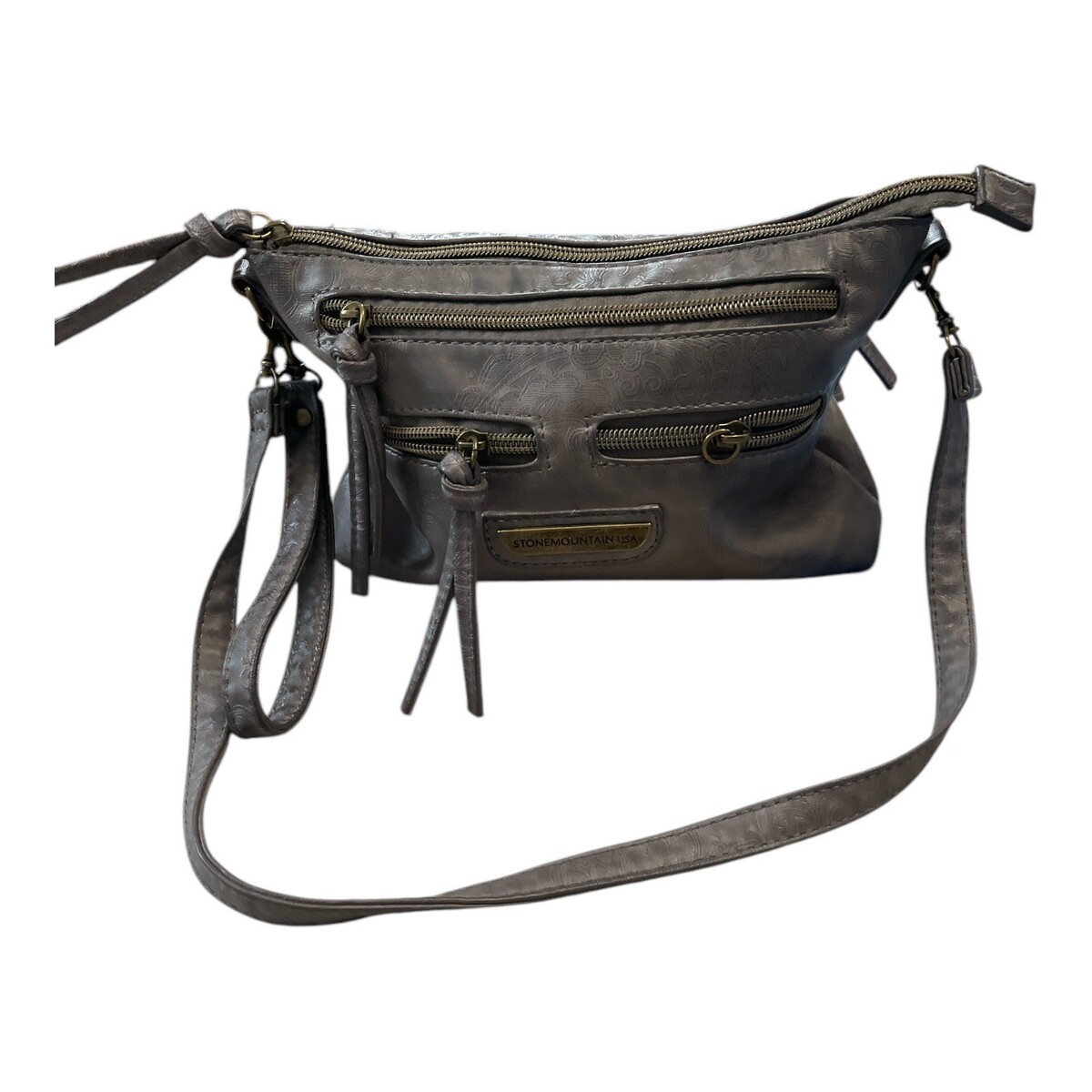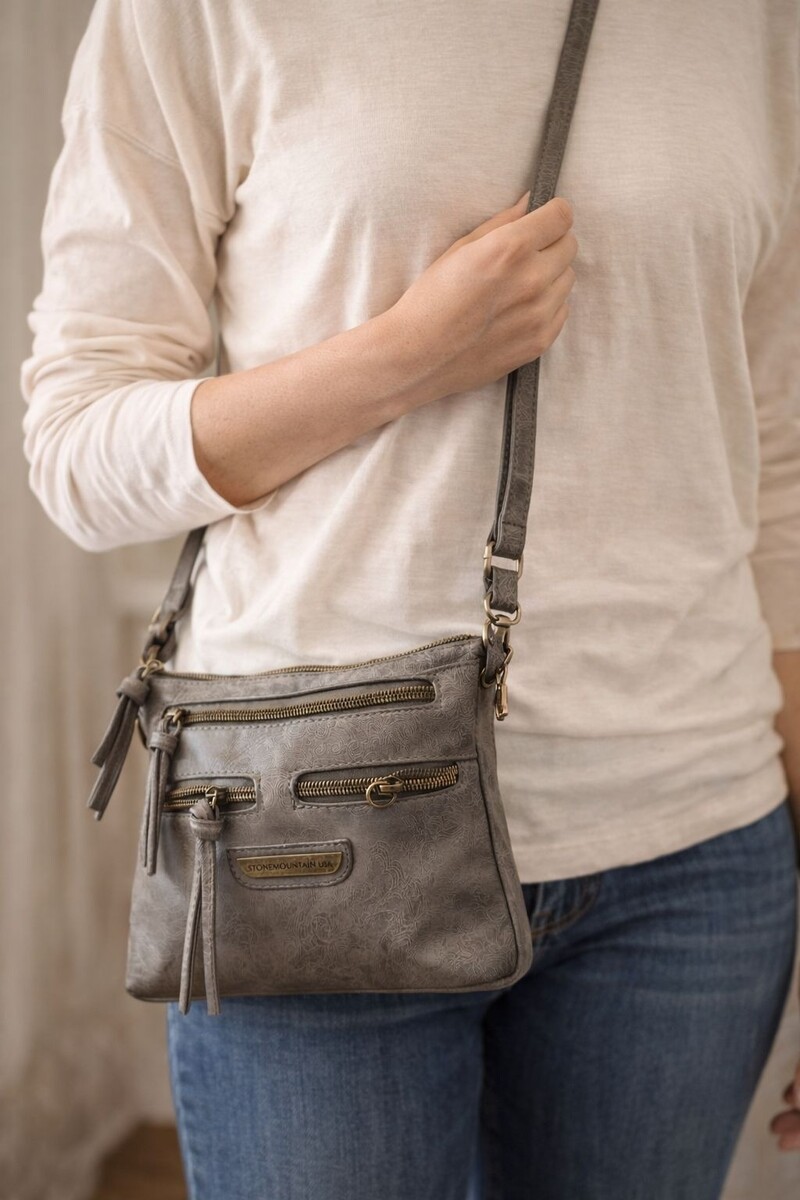 Stone Mountain USA crossbody purse featuring an embossed floral pattern and multiple zip compartments for organized storage. Lightweight and practical size for everyday wear with adjustable strap and neutral gray tone that pairs easily with casual or dressy outfits.