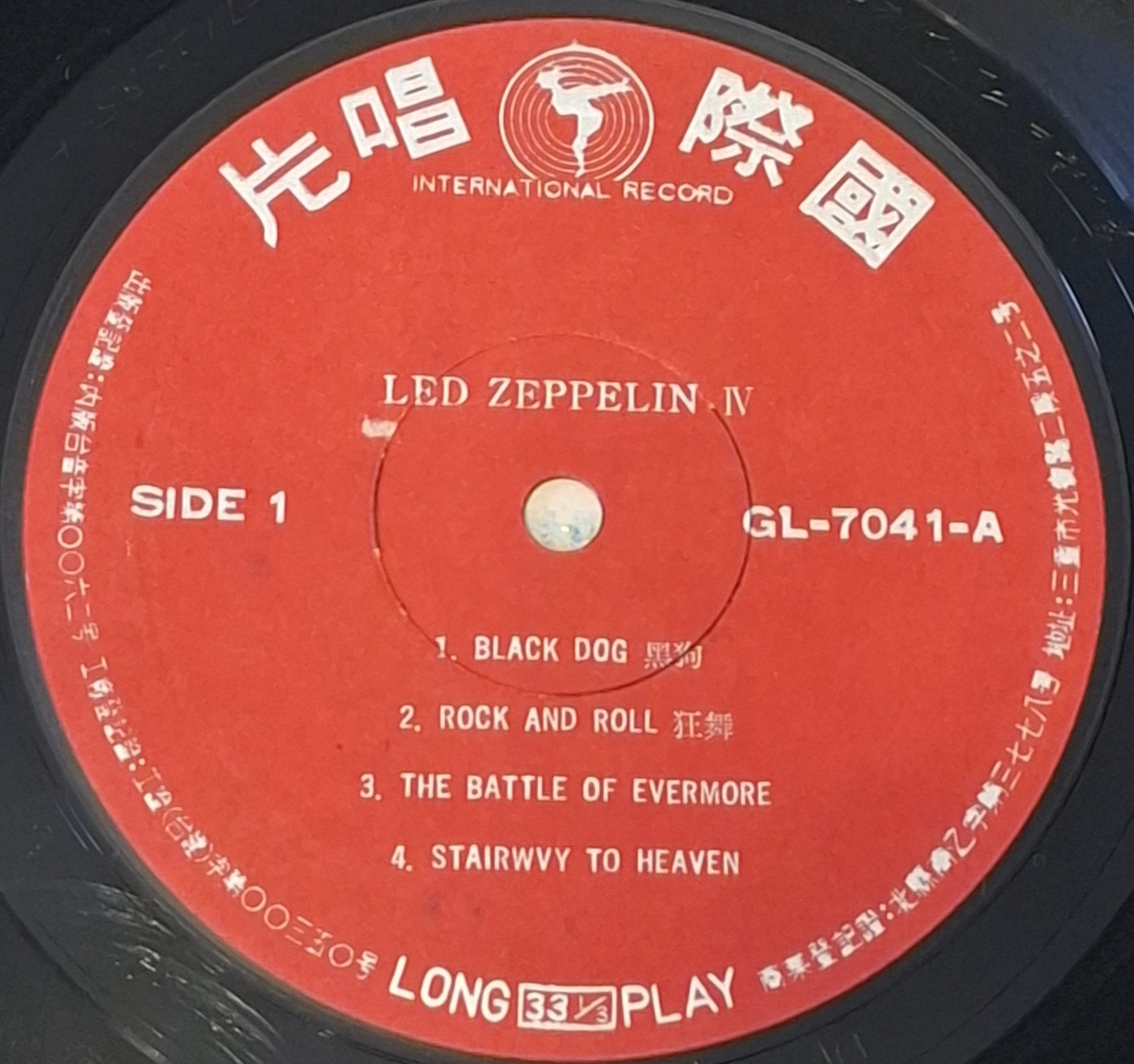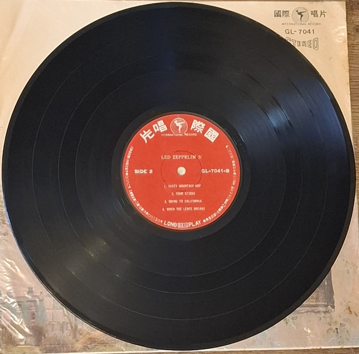 Taiwan pressing of Led Zeppelin IV on International Record, catalog GL-7041. This is the classic Taiwan issue with red labels and the original plastic-cover sleeve format used for the local market during the 1970s.