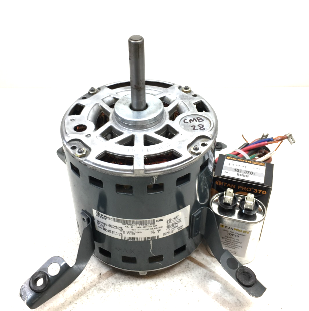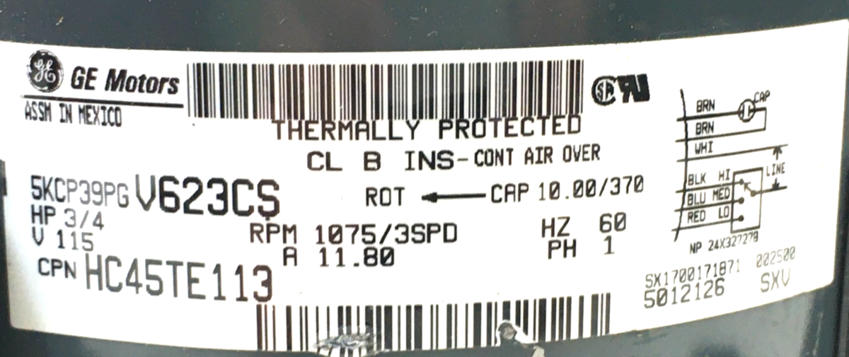 This is GE 5KCP39PGV623CS Blower Motor 3/4 HP 115V HC45TE113 RPM 1075/3SPD used part, comes with a brand new capacitor.